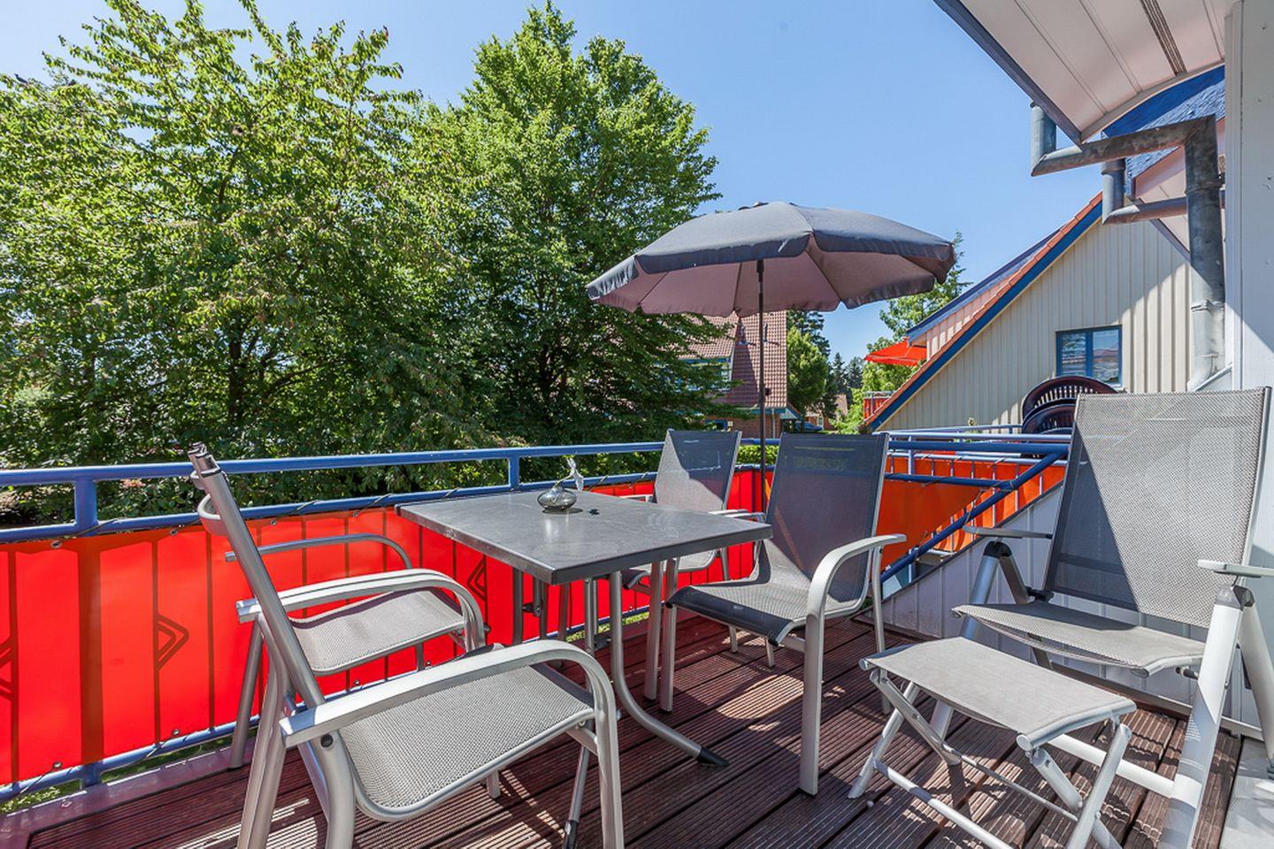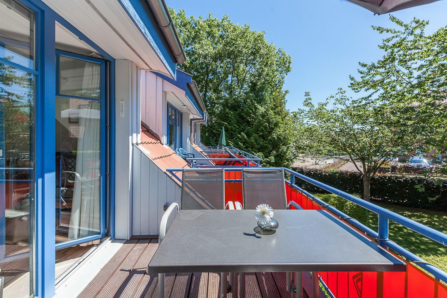 Die geräumige und kinderfreundliche 4-Zi.-Wohnung mit einem möblierten Balkon in Süd-Lage liegt im 1. OG des Hauses 15 und ist über eine Außentreppe zu erreichen. Auf ca. 70 m² Wohnfläche bewohnst du auf zwei Ebenen verteilt einen Wohn- und Essbereich, drei separate Schlafzimmer, eine Küchenzeile und ein Duschbad. Die Entfernung zum Strand beträgt vom Feriendorf Papillon etwa 250 m.