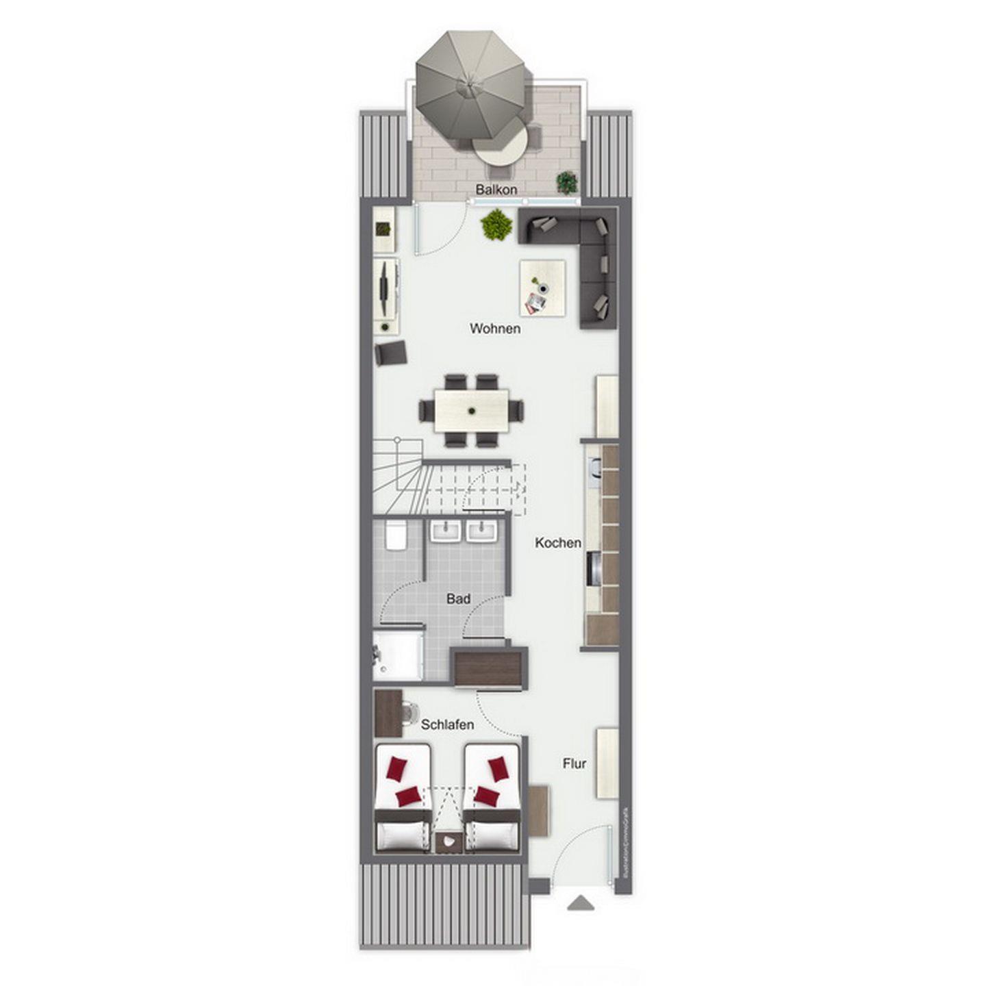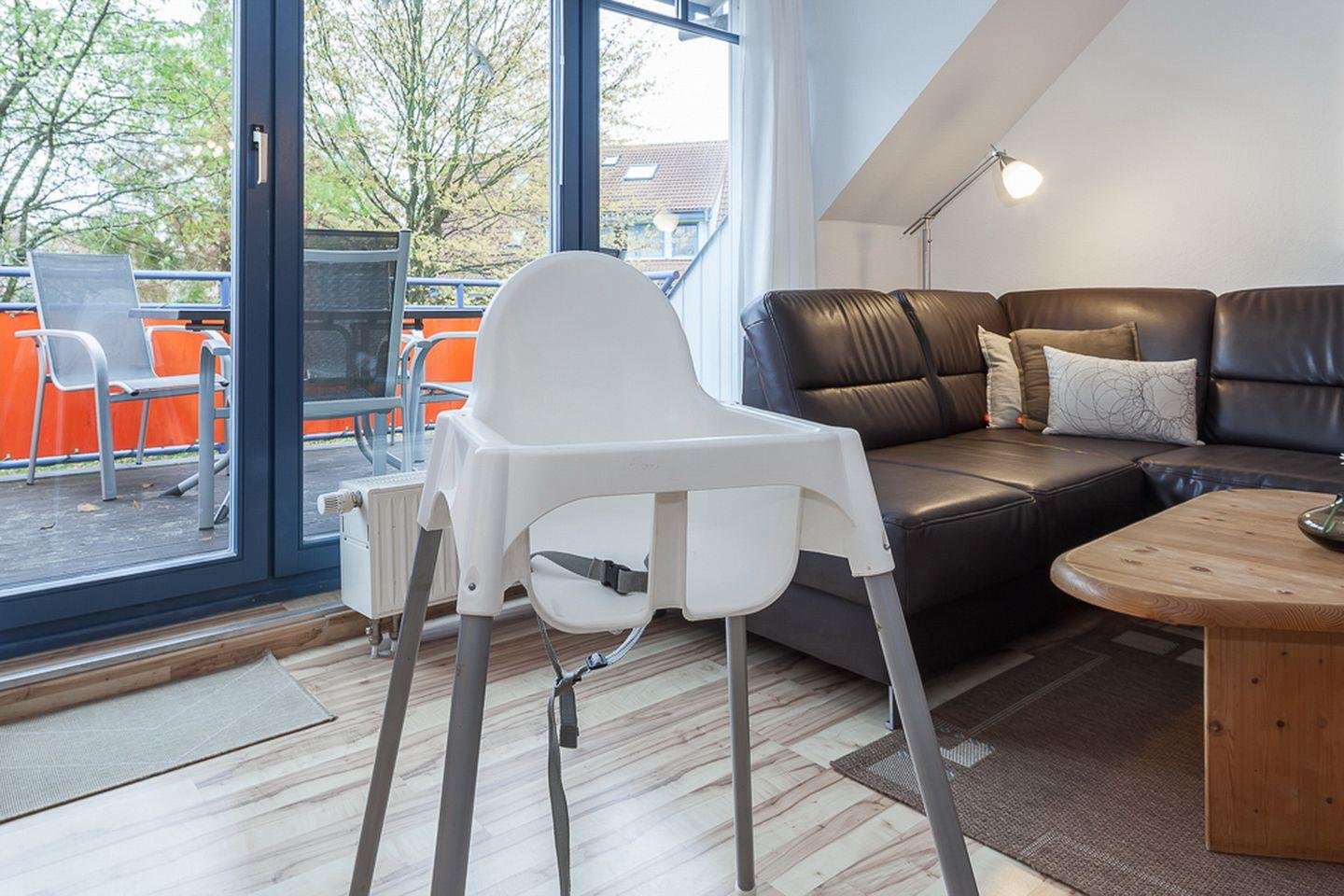 Auf den möblierten Süd-Balkon mit Blick ins Grüne gelangst du vom Wohnbereich. Das Wohnzimmer ist mit einer bequemen Eck-Couch mit Schlaffunktion (120 x 190 cm) ausgestattet. Zur Unterhaltung stehen neben einer Stereoanlage, ein großer und hochwertiger Loewe-Flachbild-TV mit Festplattenrecorder und ein DVD-Player zur Verfügung. Eine innenliegende Treppe führt dich in das Dachgeschoss mit zwei Schlafzimmern.