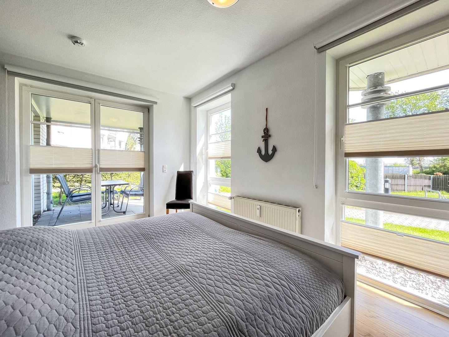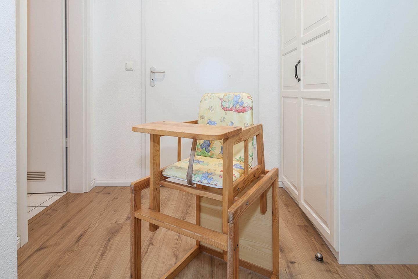 In den Schlafzimmern ermöglichen Ihnen ein Doppelbett (2 x 90 x 200 cm) und ein Einzelbett (90 x 200 cm) einen Rückzug und Ruhephasen auch tagsüber. Für ausreichend Stauraum ist mit den Kleiderschränken gesorgt. Die Fenster werden mit Rollos verdunkelt. Für die kleinen Gäste steht ein Hochstuhl und ein Kinderreisebett (ohne Matratze) zur Verfügung.