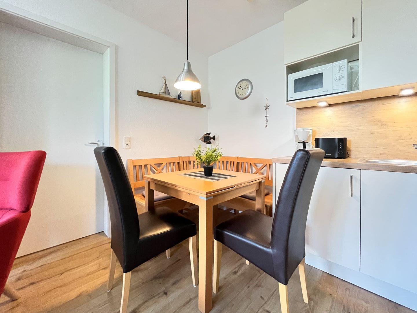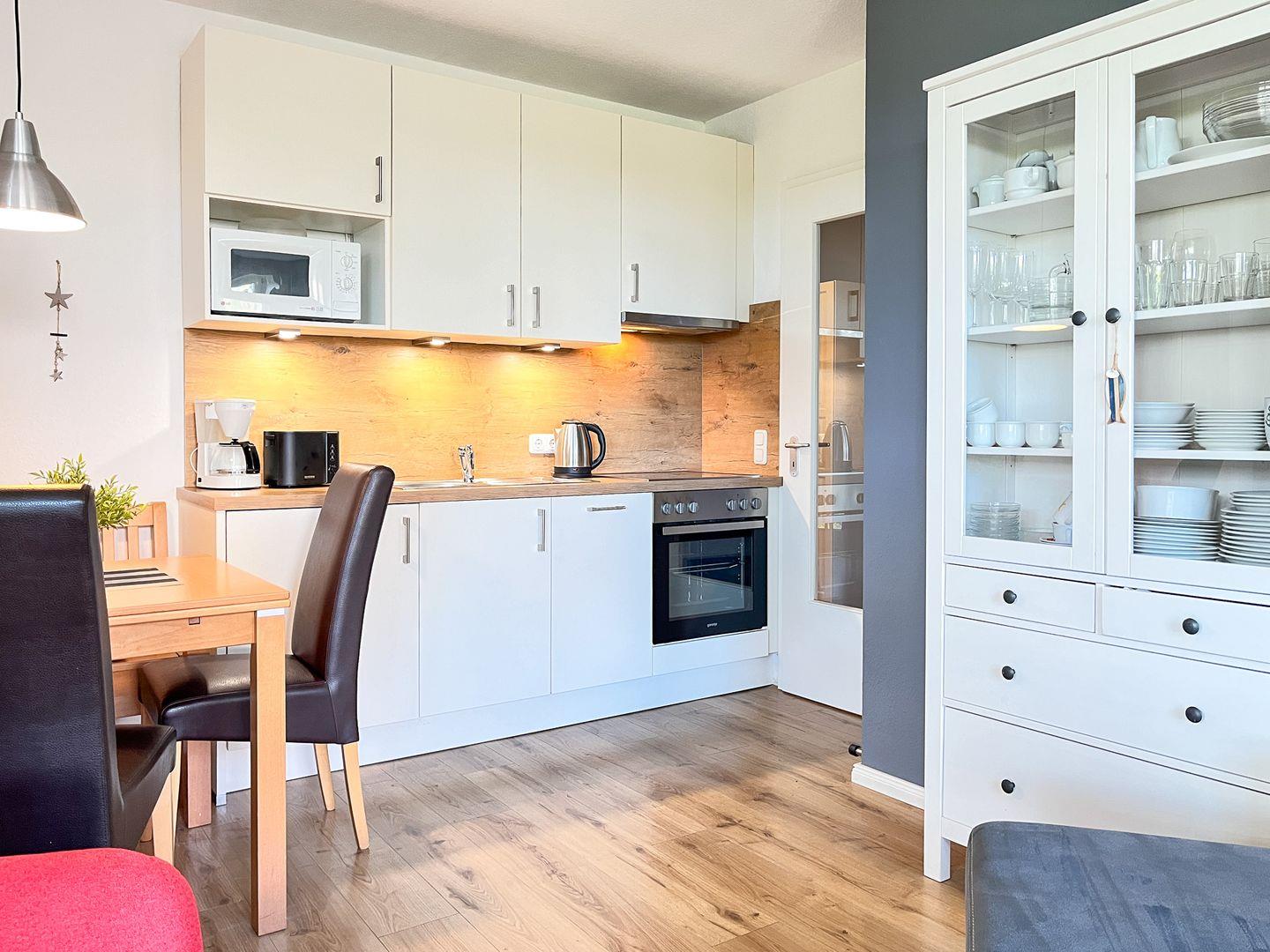 Die Küchenzeile liegt in unmittelbarer Nähe zum Essbereich. Zur dieser gehören ein Backofen, ein Geschirrspüler, eine Mikrowelle und ein 4-Platten-Cerankochfeld.