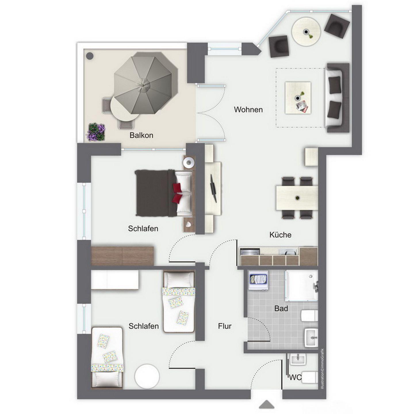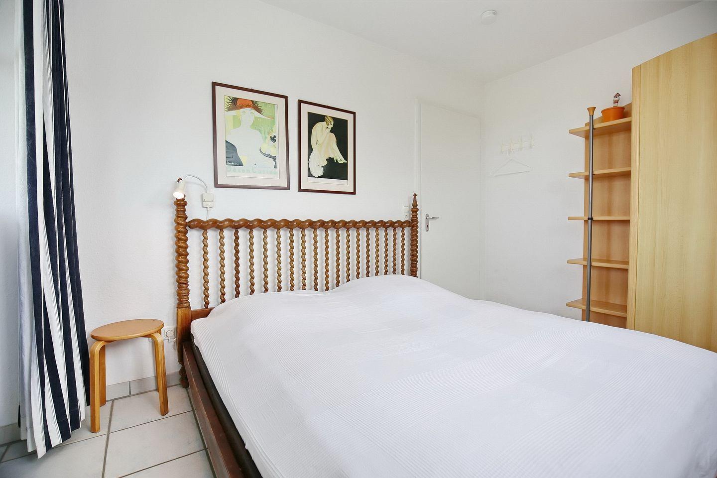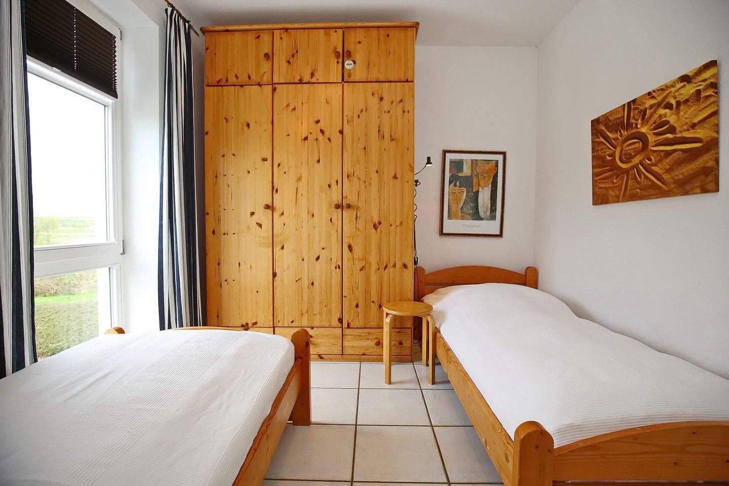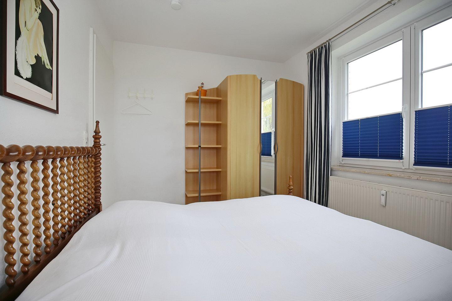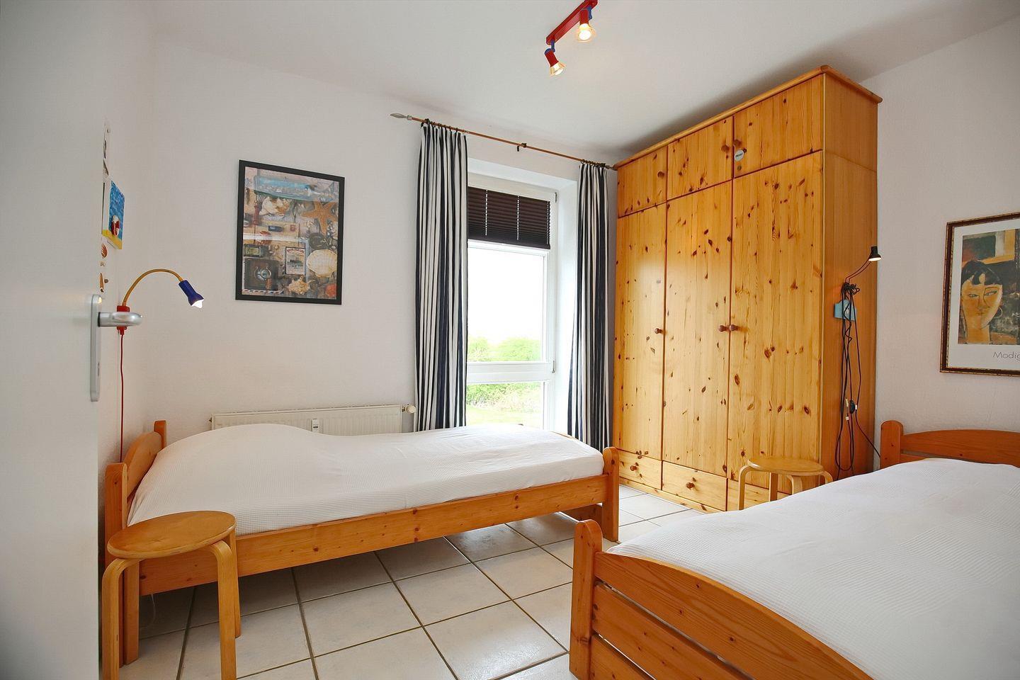 Die Schlafzimmer sind mit einem Doppelbett (2 x 90 x 200 cm) und zwei Einzelbetten (90 x 200 cm) eingerichtet. Kleiderschränke in den Räumen dienen als Ablagemöglichkeit. An den Fenstern sind Plissees und Vorhänge angebracht.