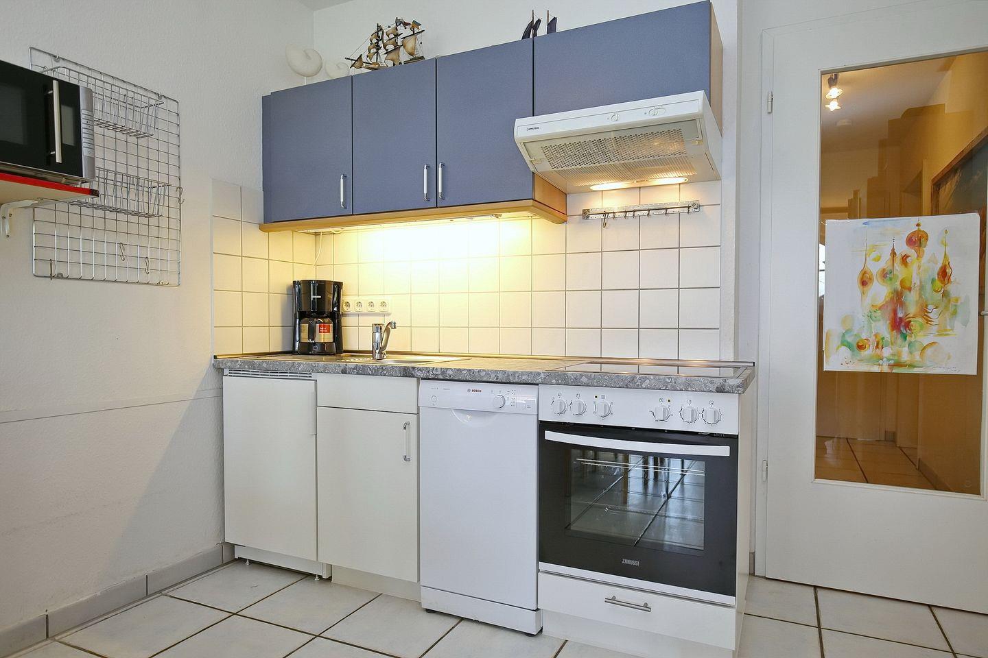 Die im offenen Stil gehaltene Küchenzeile bietet viel Raum für die Zubereitung der Mahlzeiten. Hier stehen ein 4- Plattenkochfeld, eine Mikrowelle, ein Backofen, ein Geschirrspüler und ein Kühlschrank mit Gefrierfach zur Verfügung.
