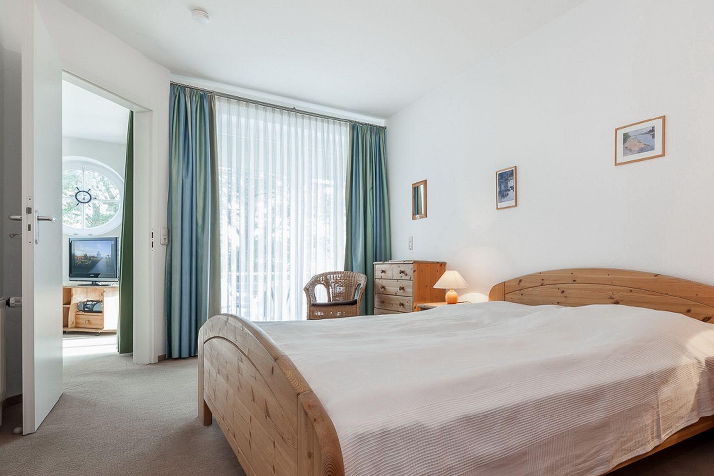 Im separaten Schlafraum steht ein Doppelbett (2 x 90 x 200 cm) bereit. Ein Kleiderschrank bietet ausreichend Stauraum für dein Urlaubsgepäck. Die Fenster werden mit Vorhängen abgedunkelt.