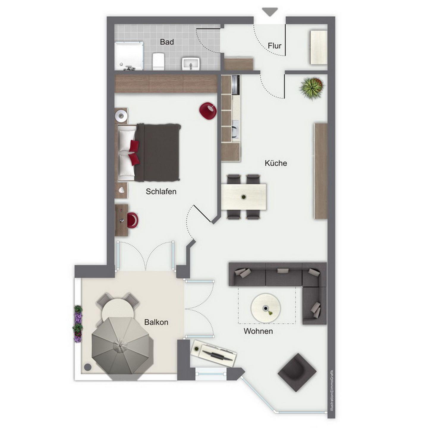 Die 2-Zimmer-Ferienwohnung mit einem Balkon zur Seeseite liegt im 1. OG des Hauses 1. Auf ca. 63 m² bewohnst du ein Wohnzimmer, ein Schlafzimmer, eine Küchenzeile und ein Duschbad. Die Entfernung zum Strand beträgt von der Ferienanlage Dünenblick ca. 50m.