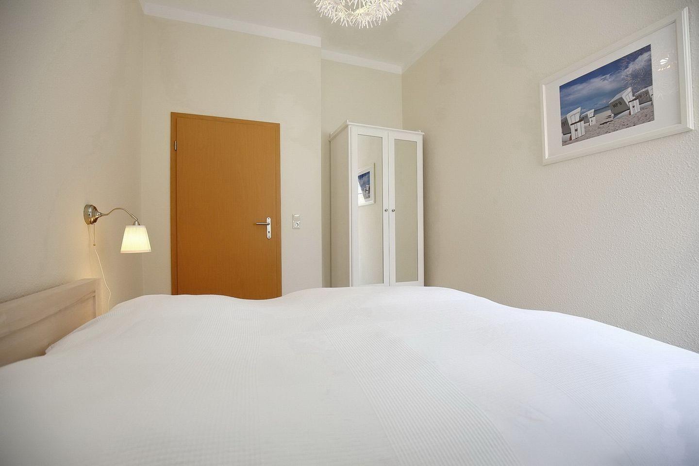 Auch im zweiten Schlafraum steht ein Doppelbett (2 x 80 x 200 cm). Hier befindet sich auch ein Kleiderschrank mit Spiegel.
