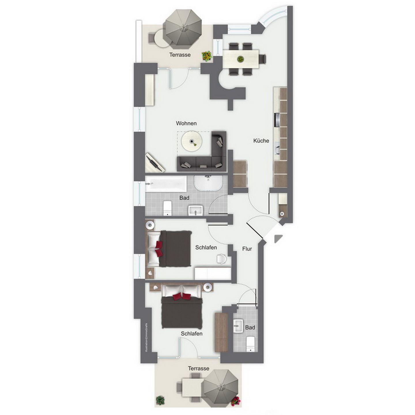 In einem Schlafzimmer ist ein Doppelbett (2 x 80 x 200 cm) vorhanden. Der Kleiderschrank mit Spiegel bietet genug Platz für deine Garderobe. Von diesem Raum erreichst du den sonnigen Südbalkon.