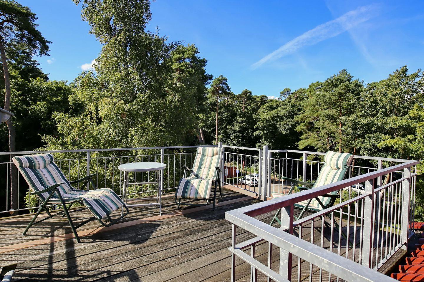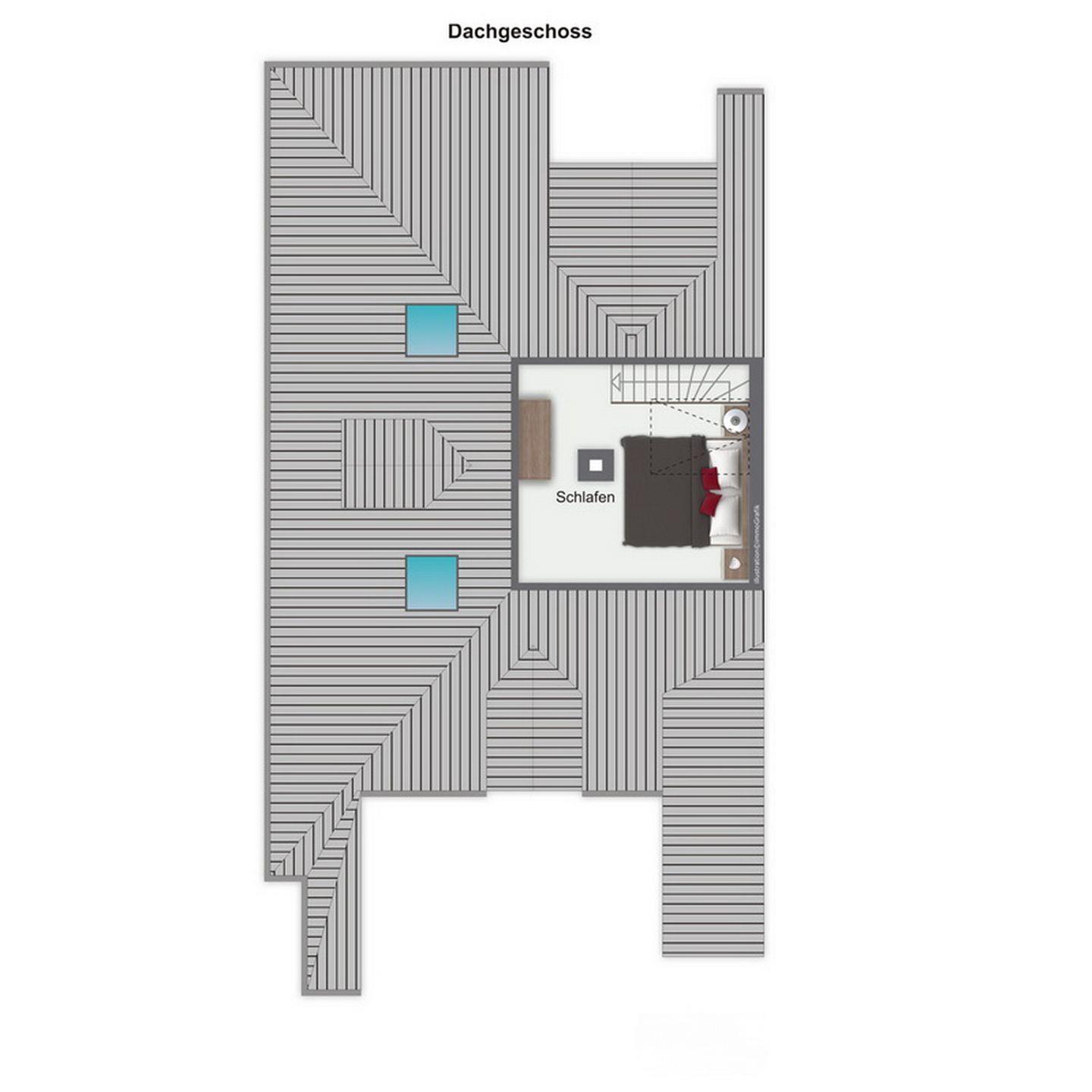 Als Schlafmöglichkeiten erwarten dich ein Doppelbett im oberen offenen Schlafbereich (2 x 80 cm x 190 cm), der mit einem Teppichboden ausgelegt ist, und 2 Einzelbetten (80 cm x 200 cm) im unteren Schlafzimmer. Hier ist der Fußboden mit Laminat ausgelegt. Von hier aus gelangst du auf die nach Süden ausgerichtete Dachterrasse, die zum Sonnenbaden einlädt.