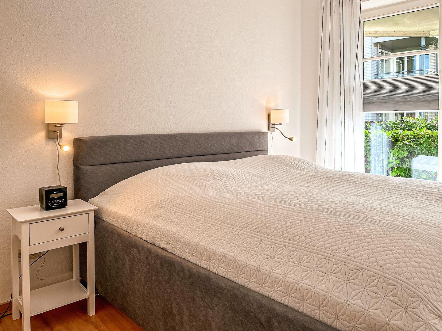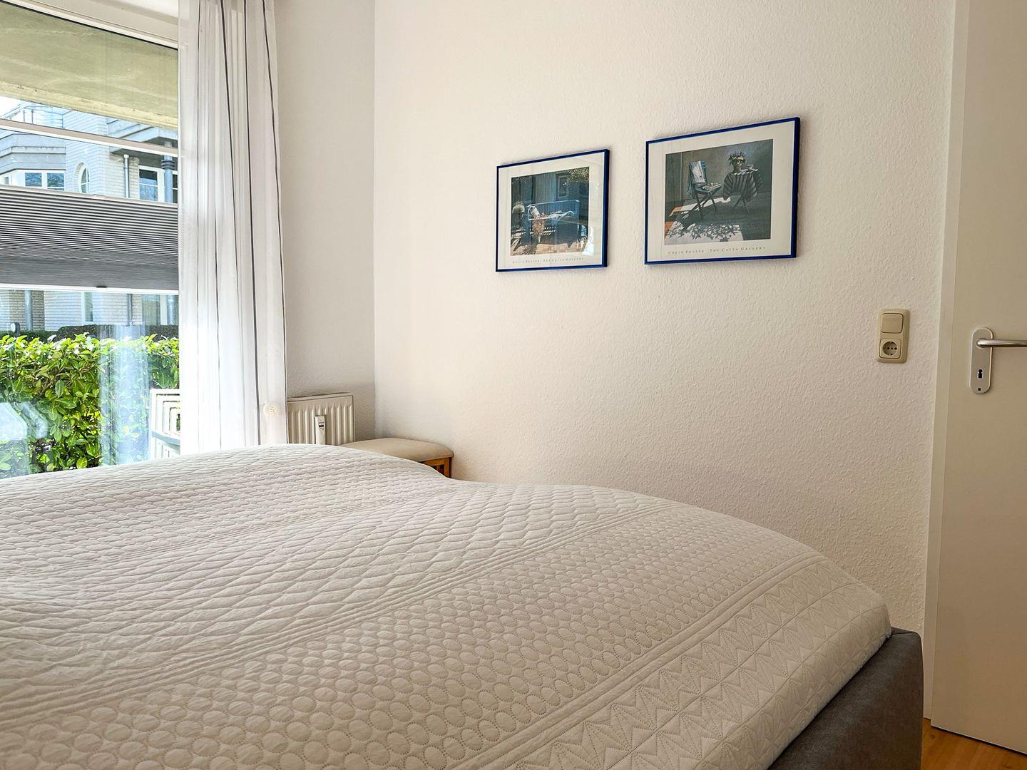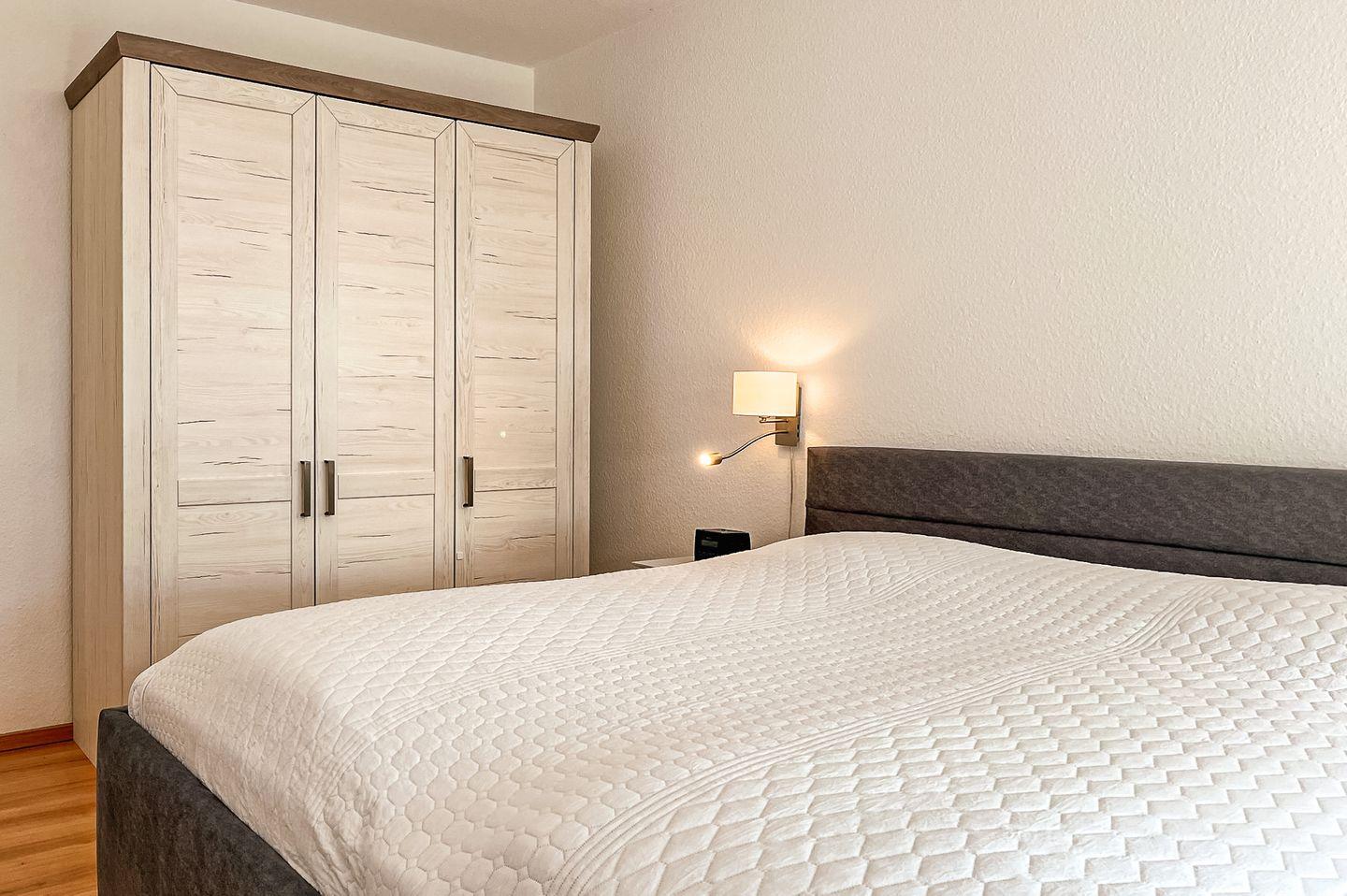 Das Schlafzimmer ist mit einem Doppelbett (180 x 200 cm) und einem Kleiderschrank für die Urlaubsgarderobe möbliert. Ein zweiter großer Kleiderschrank auf dem Flur bietet weiteren Stauraum. Zur Verdunkelung gibt es Vorhänge an den Fenstern.