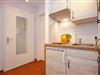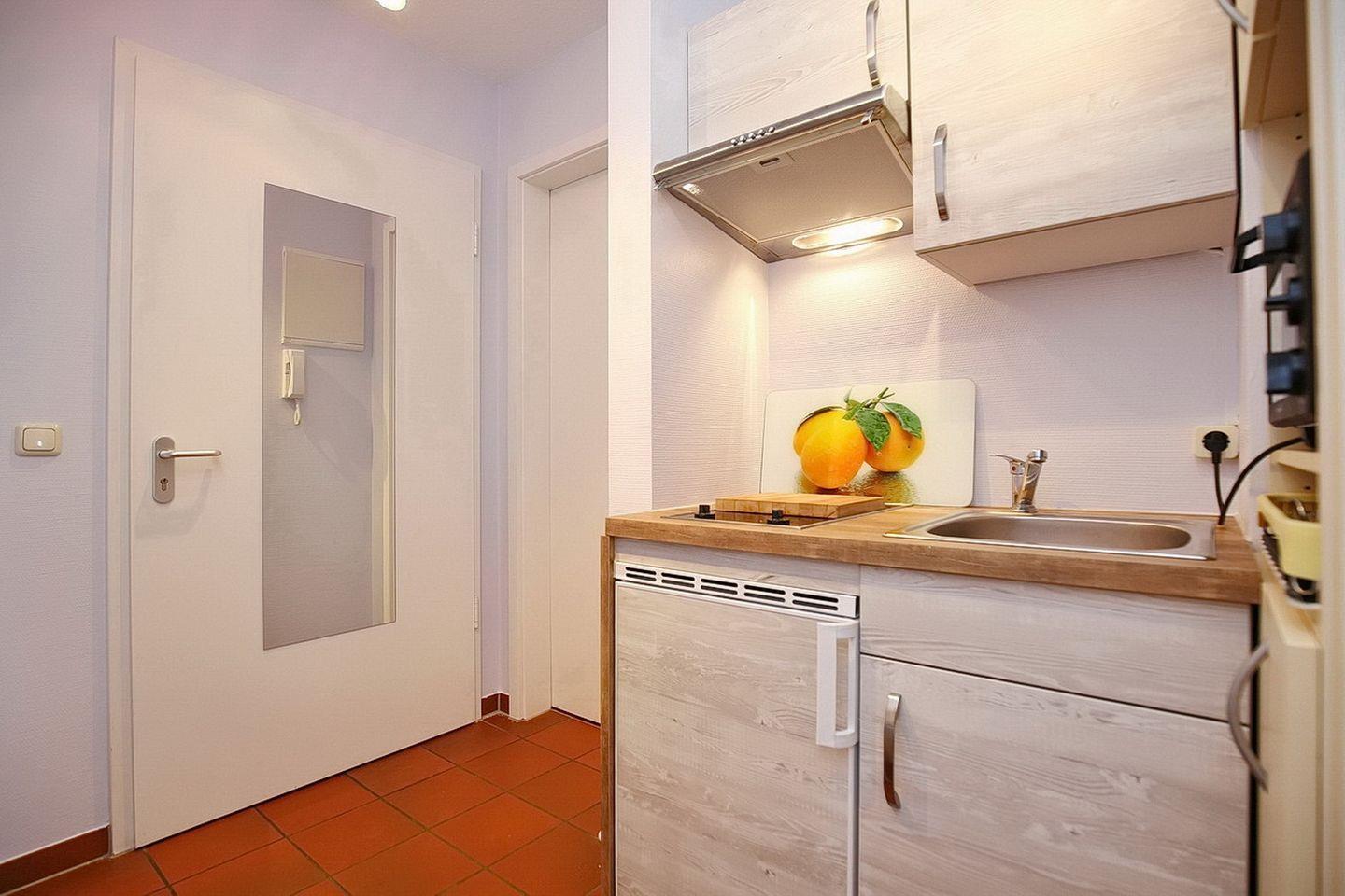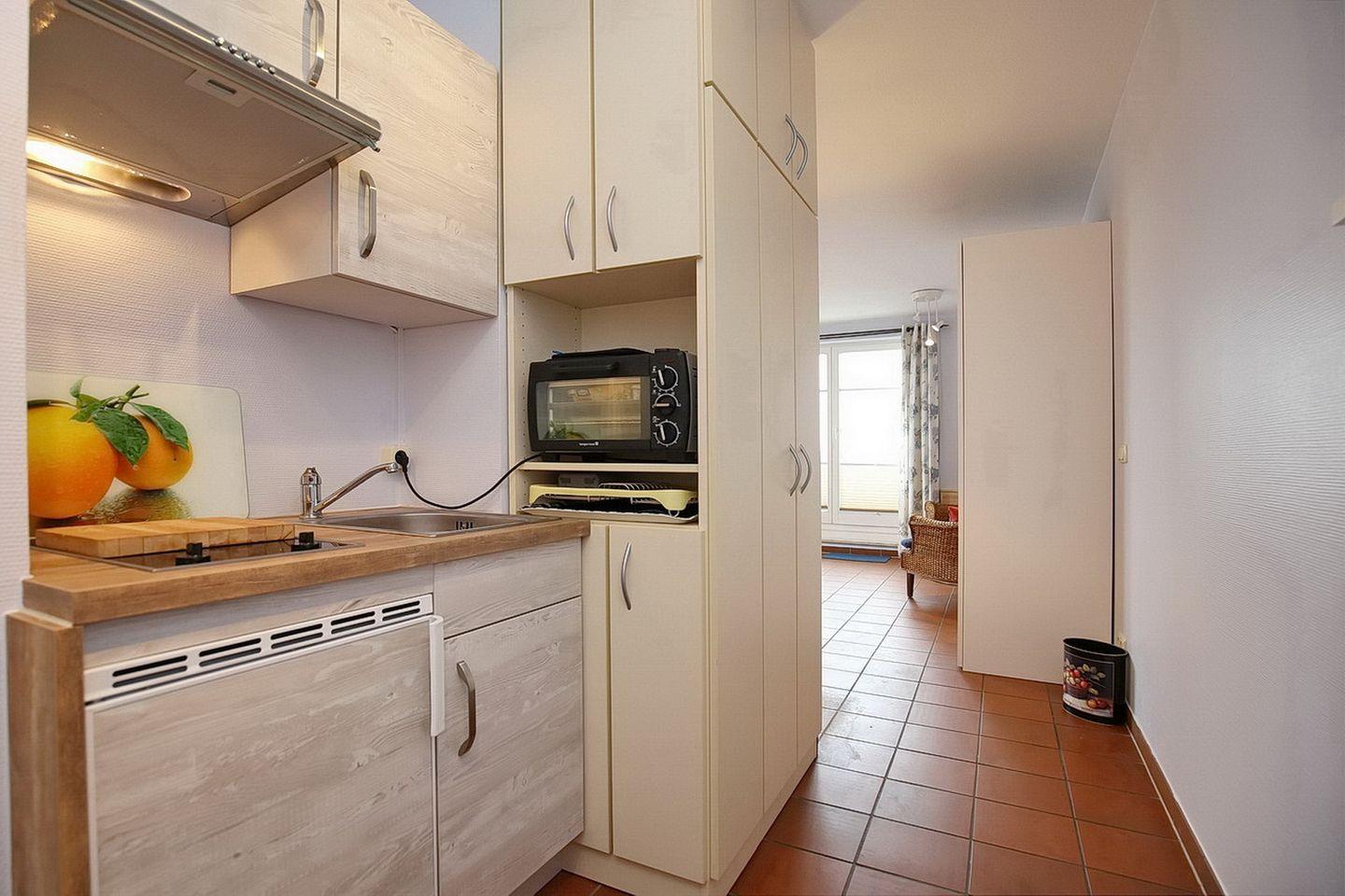 In der kleinen Kochnische befinden sich ein 2-Platten-Cerankochfeld, einen Kühlschrank mit Gefrierfach und eine Mikrowelle. In unmittelbarer Nähe ist der Essbereich platziert.