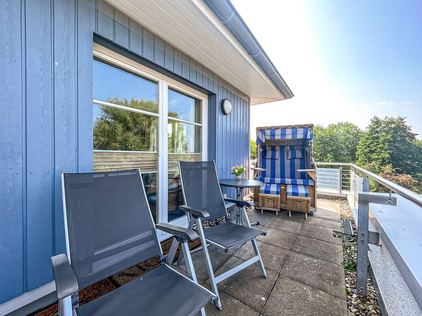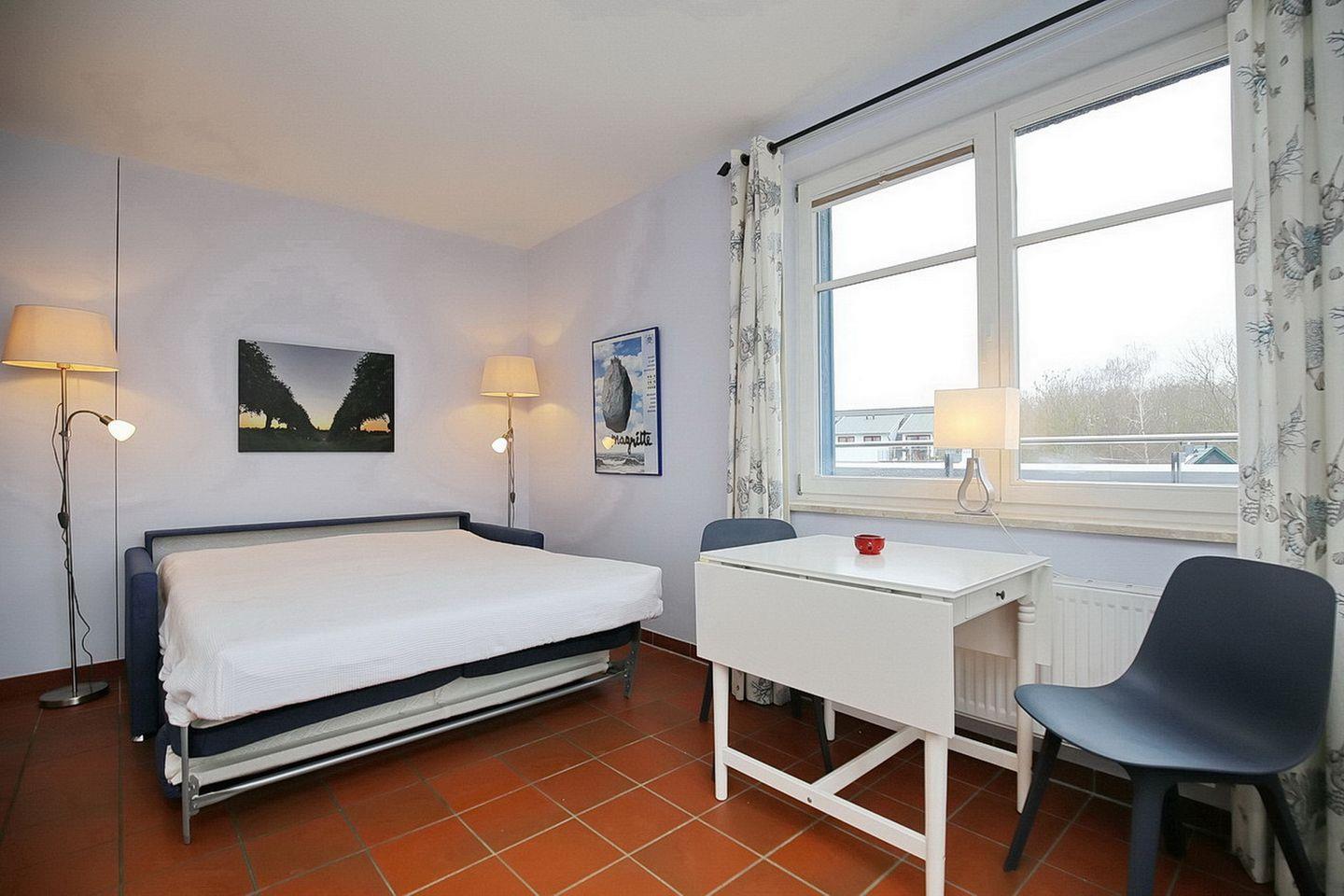 Genießen Sie auf dem möblierten Balkon mit Strandkorb den weiten Blick auf die Salzwiesen und den Teilseeblick auf die Ostsee. Der Wohn-/Schlafraum ist mit komfortablen Korbsesseln und einem praktischen Schlafsofa mit Matratze (1,40 x 2,00 m) eingerichtet. Hier finden Sie auch Ablagemöglichkeiten für die mitgebrachte Garderobe. Abwechslung am Abend bieten ein Flachbild-TV und eine Stereoanlage. An den Fenstern sind Vorhänge und Plissees angebracht.