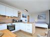 In der integrierten Küchenzeile können ein 4-Plattencerankochfeld mit Backofen, ein Geschirrspüler, ein Kühlschrank mit Gefrierfach und eine Mikrowelle genutzt werden. Auch eine kleine Essecke hat hier ihren Platz gefunden.