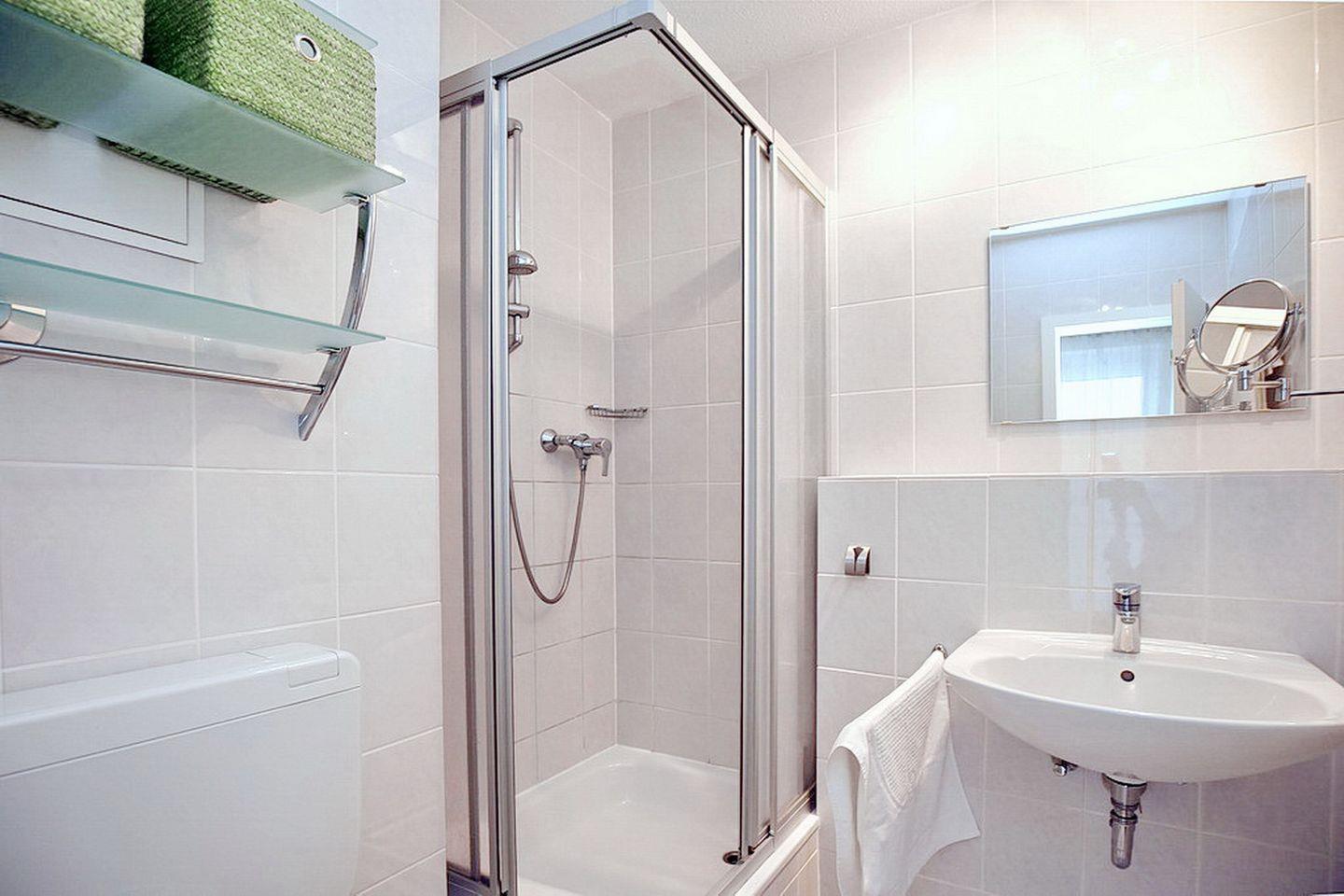 Ein gefliestes Duschbad ist ebenfalls vorhanden. In dieser Nichtraucherwohnung ist maximal ein Haustier gestattet.