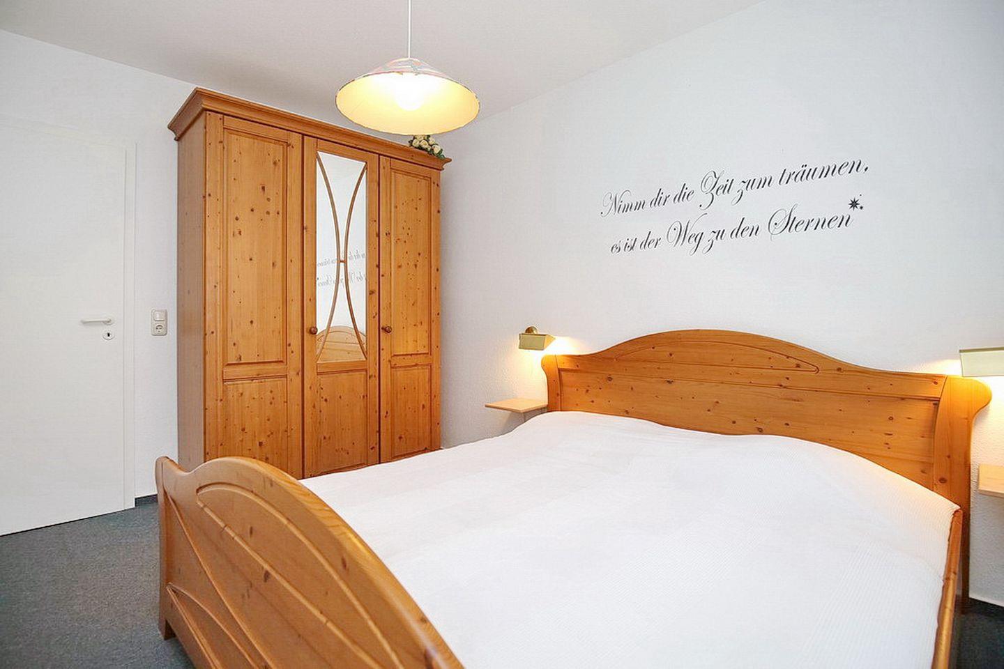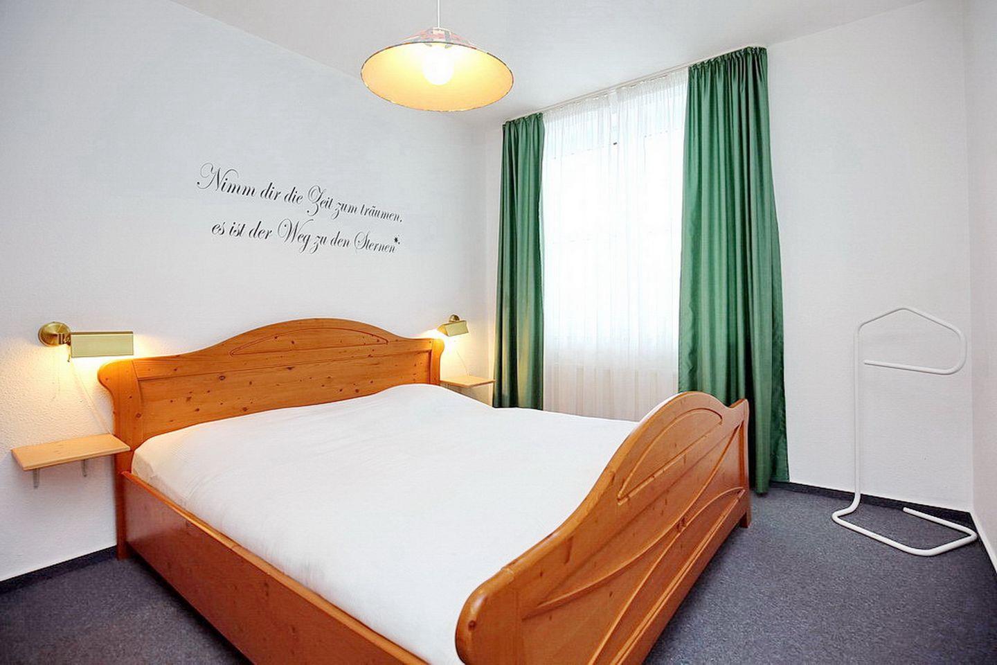 Das bequeme Doppelbett (2 x 90 x 200 cm) und Vorhänge an den Fenstern sorgen für einen entspannten Schlaf. Ein 3-türiger Kleiderschrank bietet Ablagemöglichkeit für die mitgebrachte Garderobe. Der Schlafbereich ist mit Teppichboden und das Wohnzimmer mit Laminat ausgelegt.