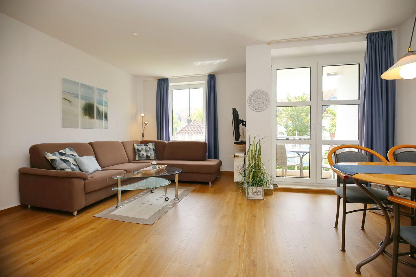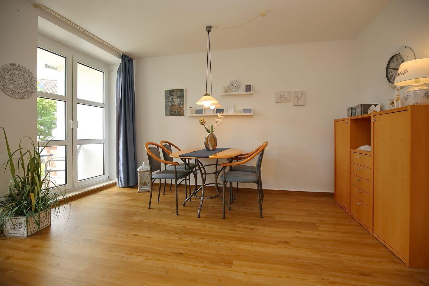 Auf den möblierten Balkon in Süd-Ost-Lage gelangst du aus dem Wohnbereich. Das Wohnzimmer ist mit einer bequemen Eck-Couch und einem Essbereich für die gemeinsamen Mahlzeiten ausgestattet. Für Kurzweil sorgen ein Flachbild-TV und ein DVD-Player. Hier befindet sich als Schlafmöglichkeit für zwei Personen auch ein platzsparendes Schrankbett (2 x 80 x 200 cm).