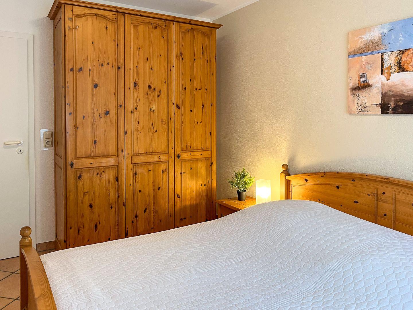 Im Schlafzimmer sorgt das große Doppelbett (2 x 90 x 200 cm) für erholsamen Schlaf. Deine Urlaubsgarderobe findet in dem geräumigen Kleiderschrank ihren Platz. Zur Verdunkelung dienen Vorhänge und ein Rollo. Zusätzlich ist ein Fliegengitter vorhanden.