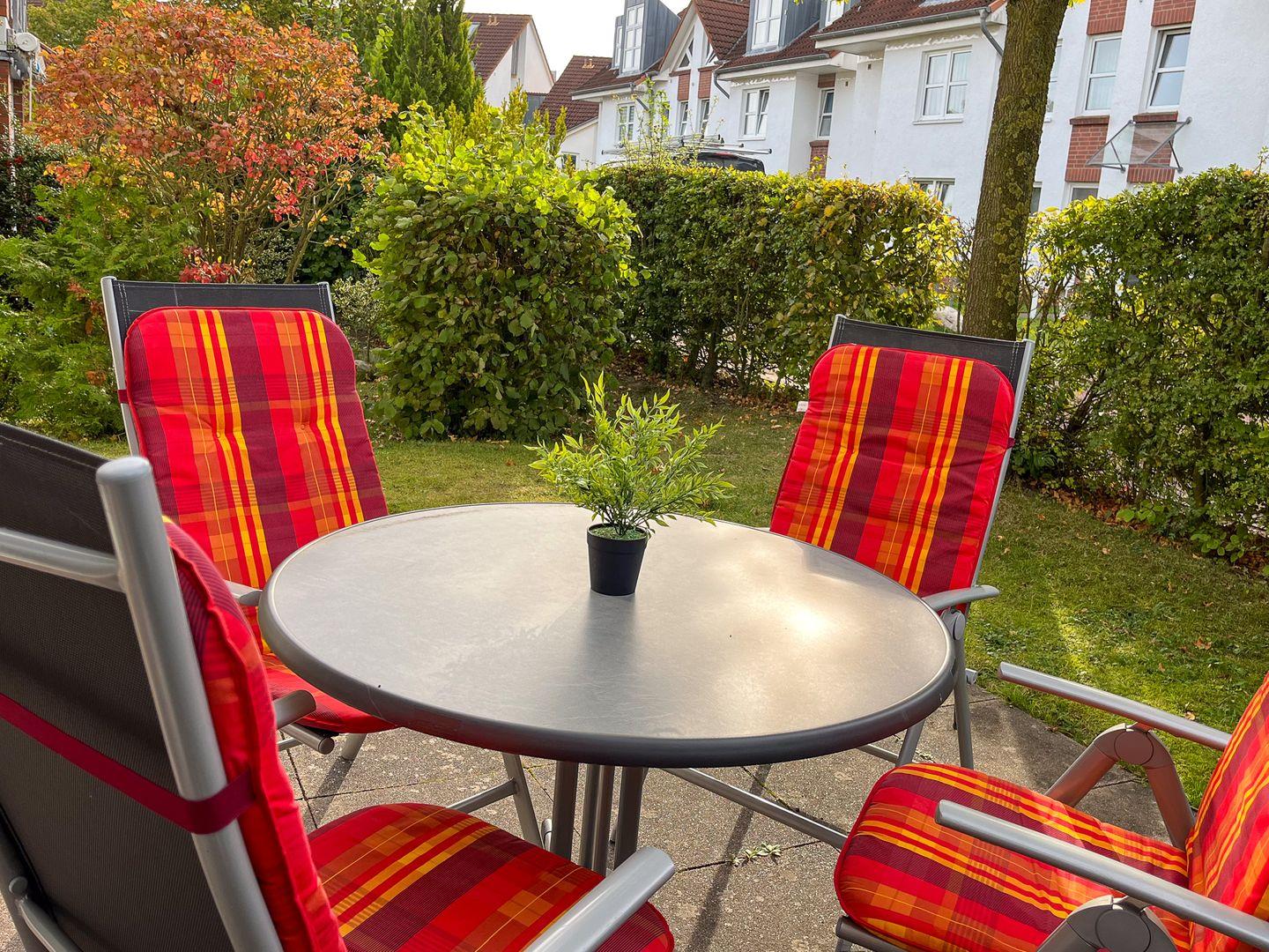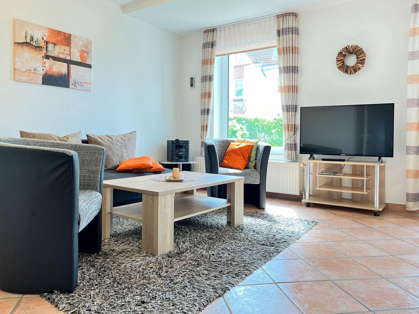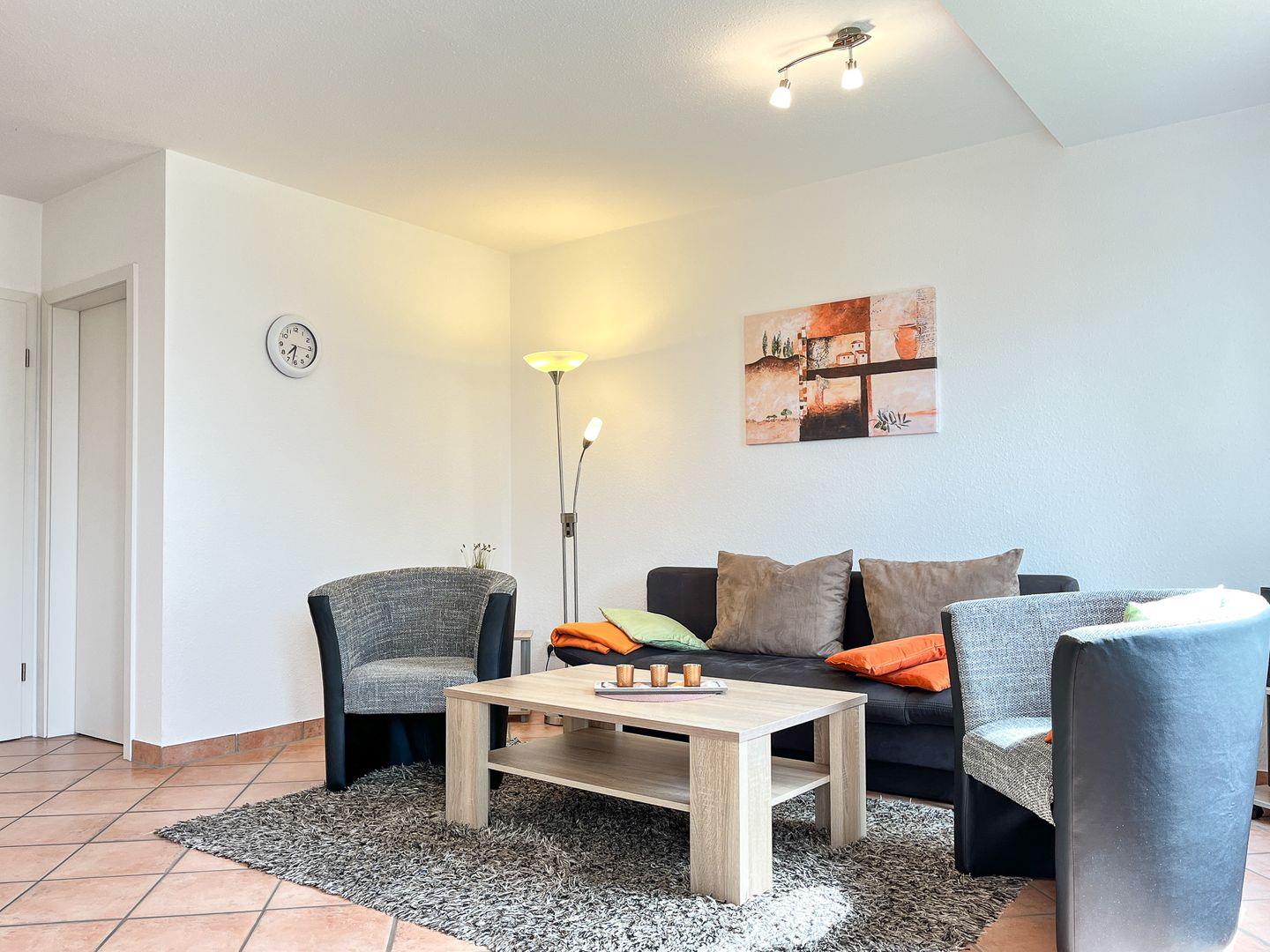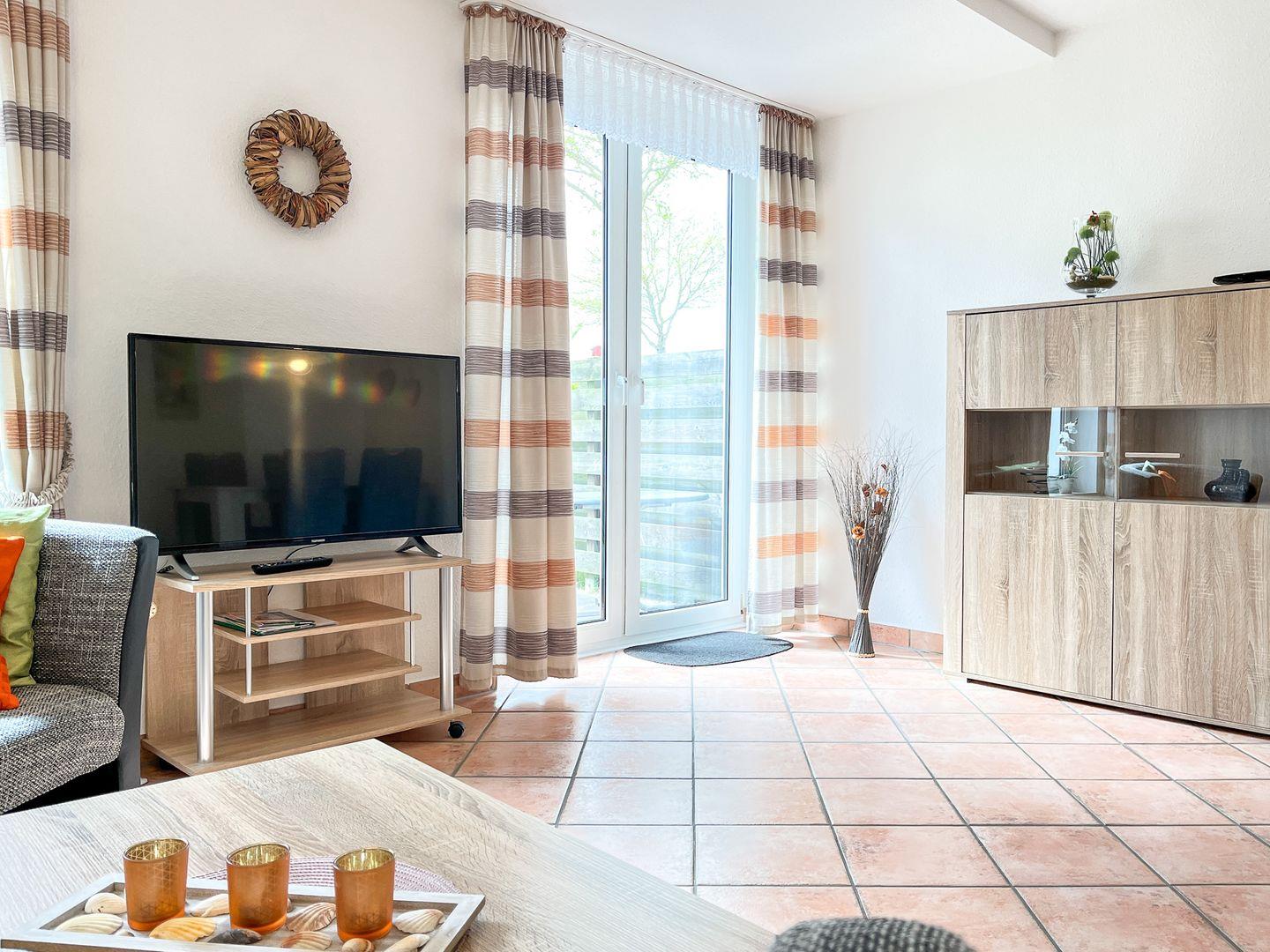 Du betrittst aus dem modernen Wohnzimmer die süd-östlich ausgerichtete, möblierte Terrasse. Eine ausziehbare Schlafcouch (140 x 190 cm) kann als Schlafmöglichkeit für zwei Personen genutzt werden. Für Abwechslung sorgen ein moderner Flachbild-TV, eine Stereoanlage sowie eine Auswahl an Spielen und Bücher. Das Kinderreisebett (ohne Extra-Matratze) und der Kinderhochstuhl können kostenfrei genutzt werden. In der Wohnung sind Fliesen verlegt.