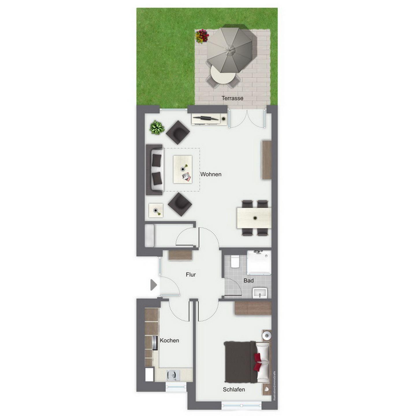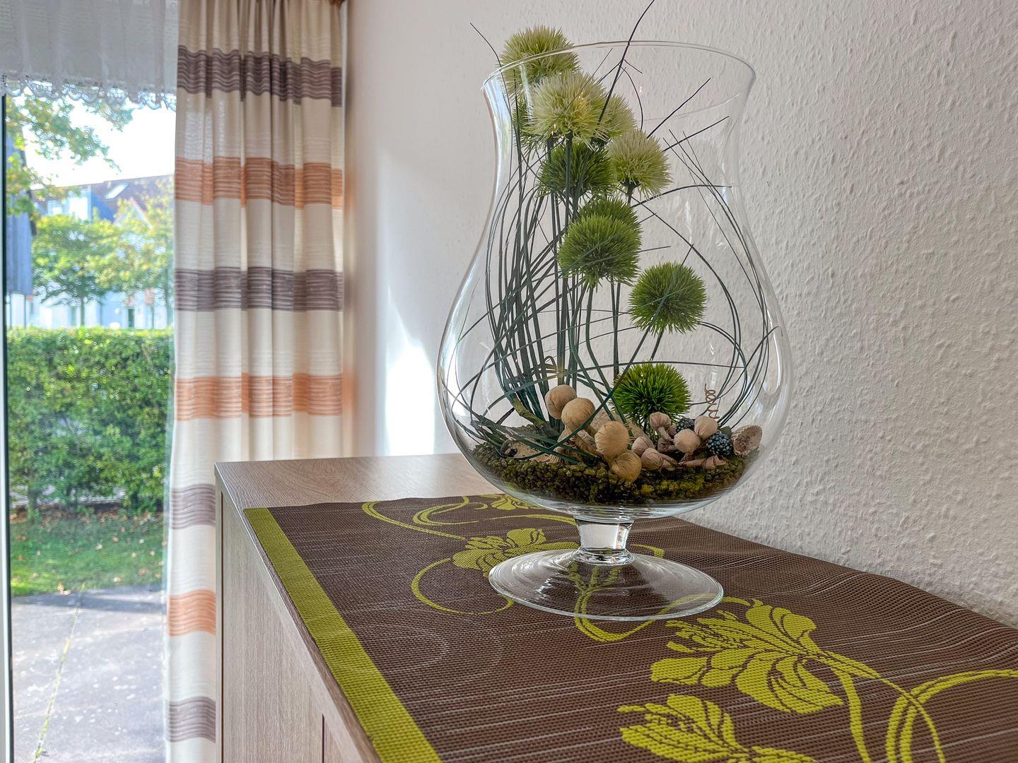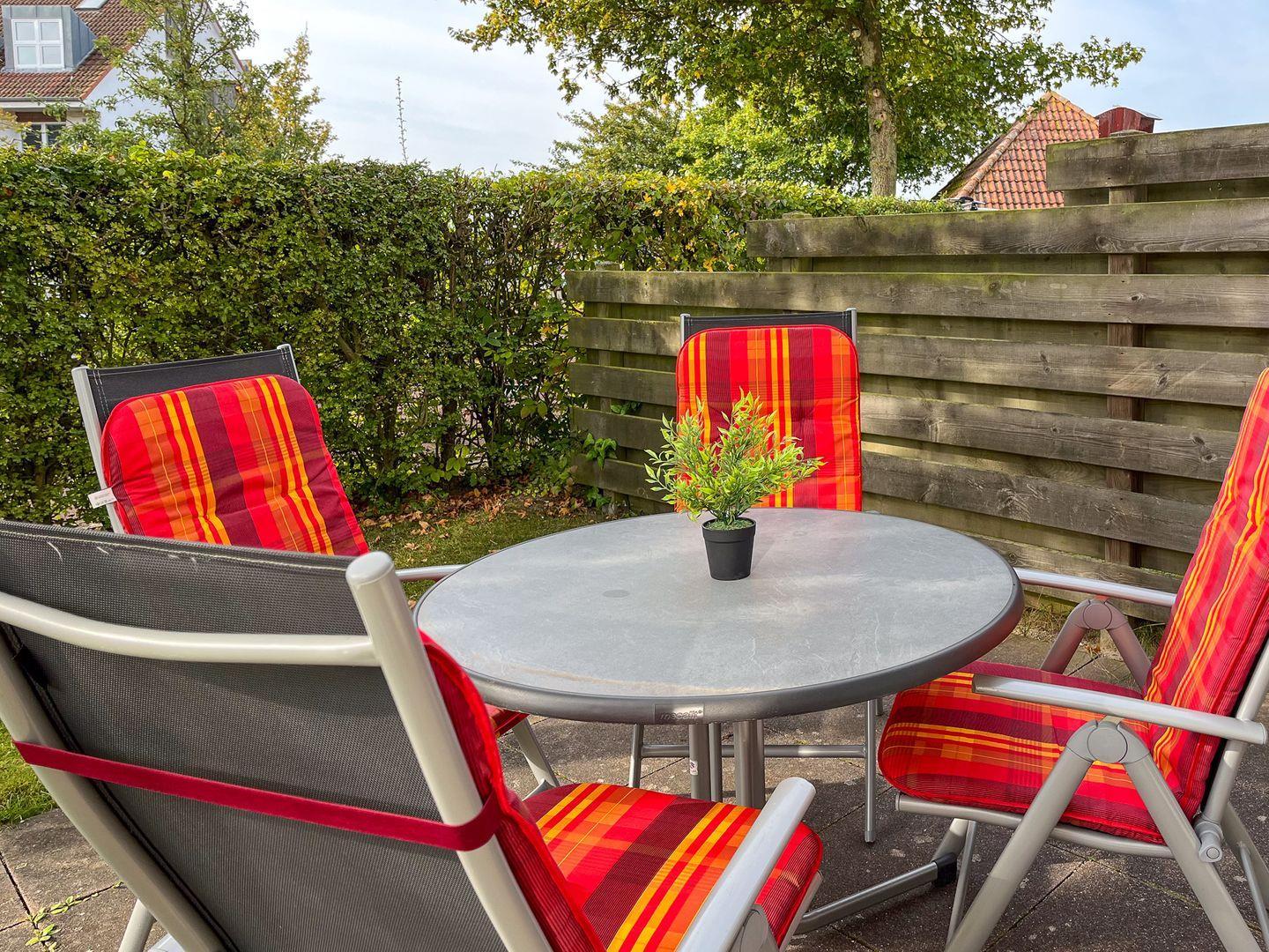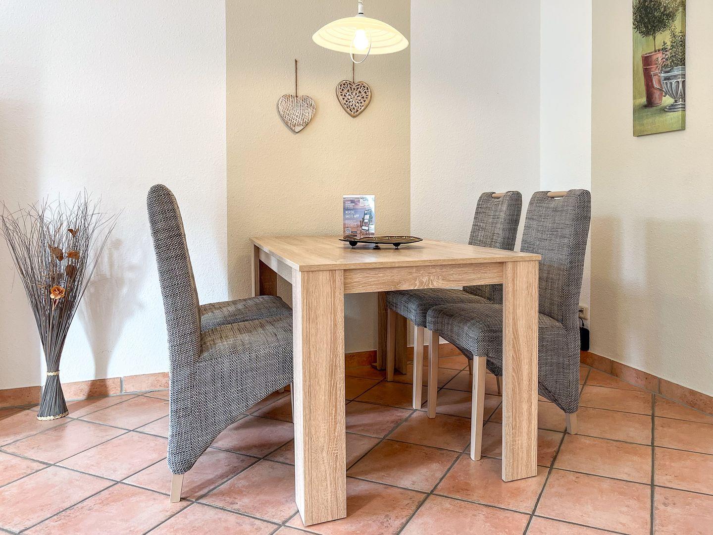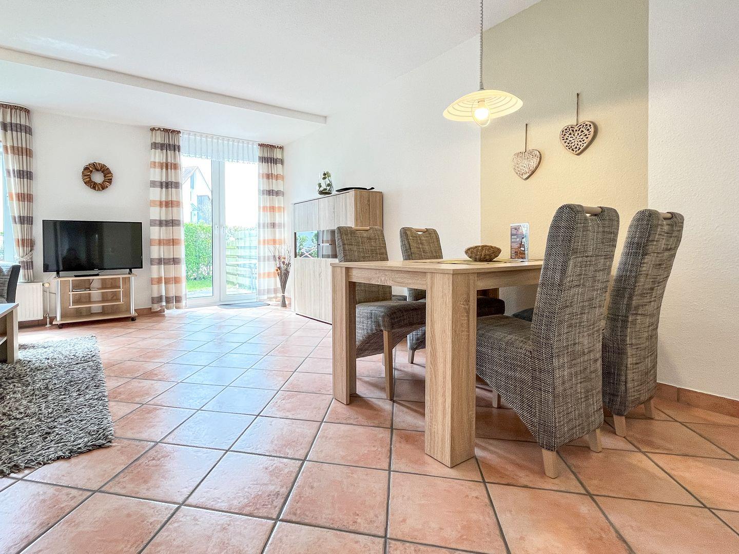 Auf einer Fläche von ca. 53 m² bewohnst du eine moderne Wohnung im Erdgeschoss mit einem eigenen Zugang. Für erholsame Ferientage stehen dir ein Wohnzimmer mit Essbereich, ein Schlafzimmer, eine separate Küche, ein Duschbad und eine Terrasse (inkl. 2 Liegen) zur Verfügung. Die Entfernung zum Strand beträgt von der Ferienanlage Sünnslag ca. 400 m.
