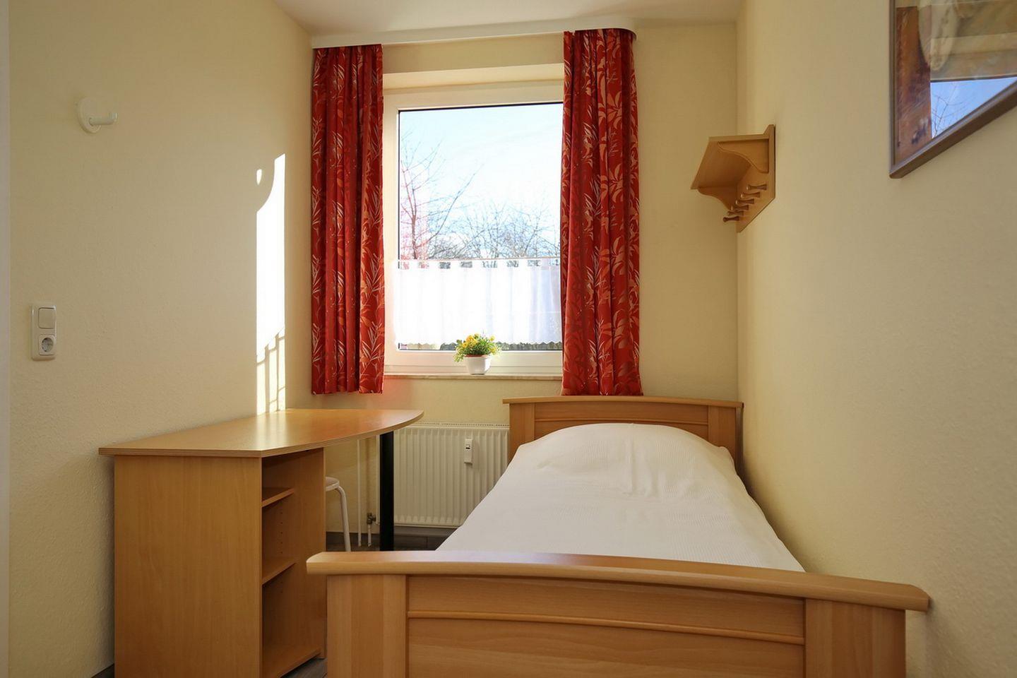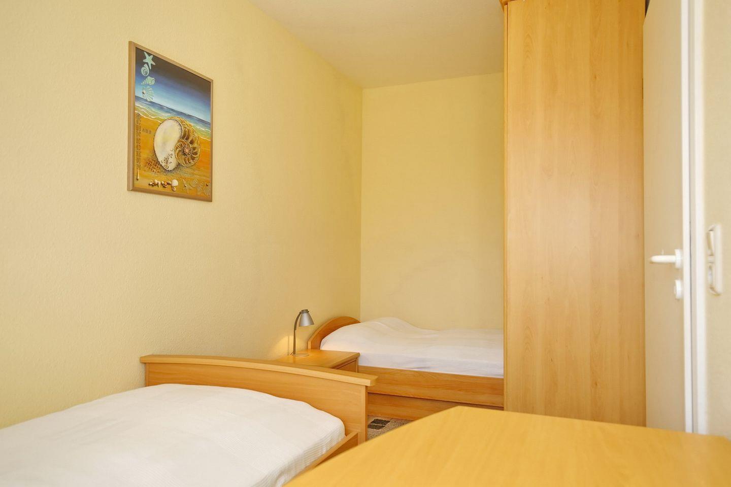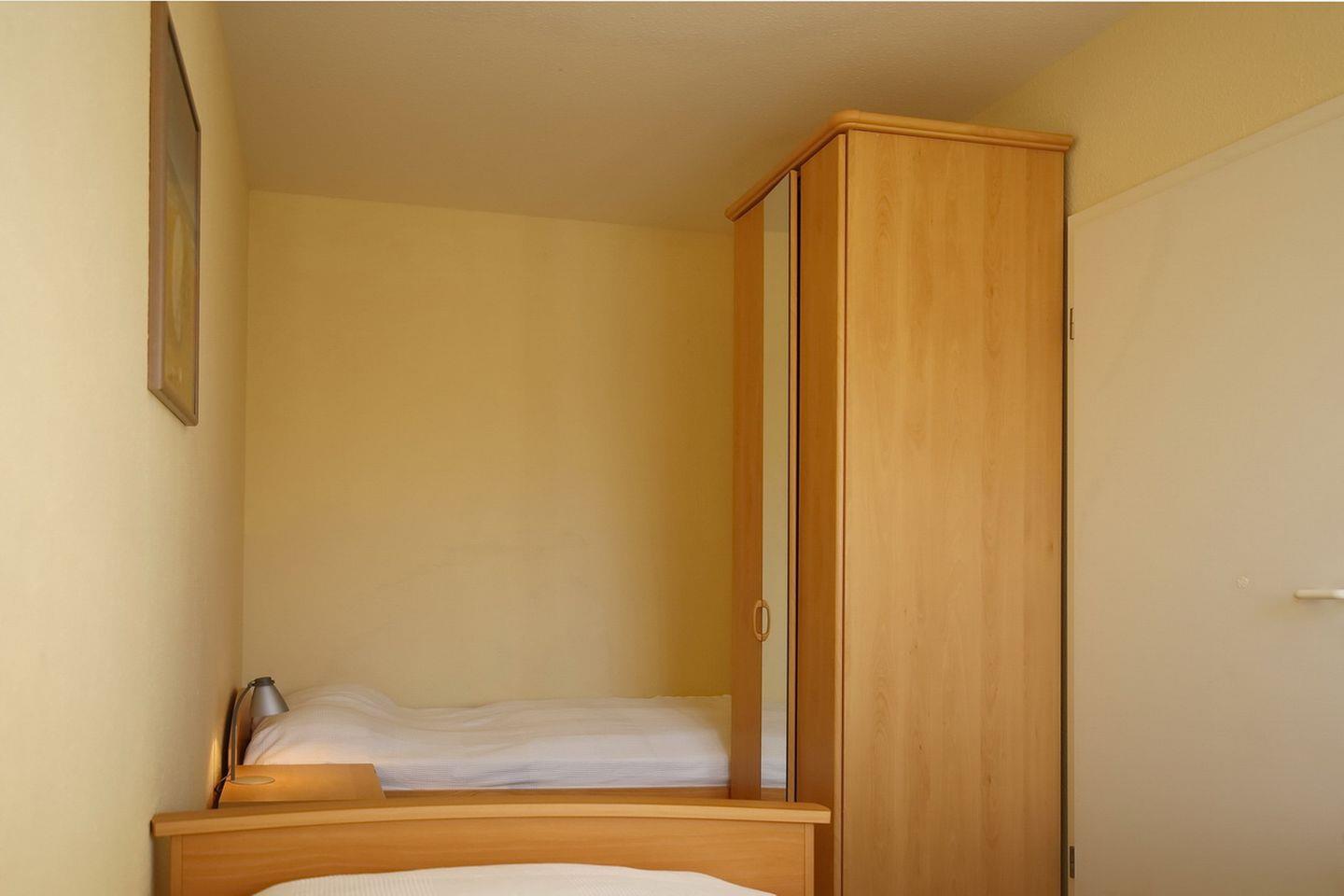 Das erste Schlafzimmer ist mit einem Doppelbett mit einer durchgängigen Matratze (160 x 200 cm) und einem Kleiderschrank eingerichtet. In dem zweiten Schlafzimmer findest du zwei Einzelbetten (2 x 90 x 200 cm) und ebenfalls einen Kleiderschrank vor. Als Sichtschutz an den Fenstern dienen Vorhänge. Beide Schlafzimmer sind mit Teppichboden ausgelegt.