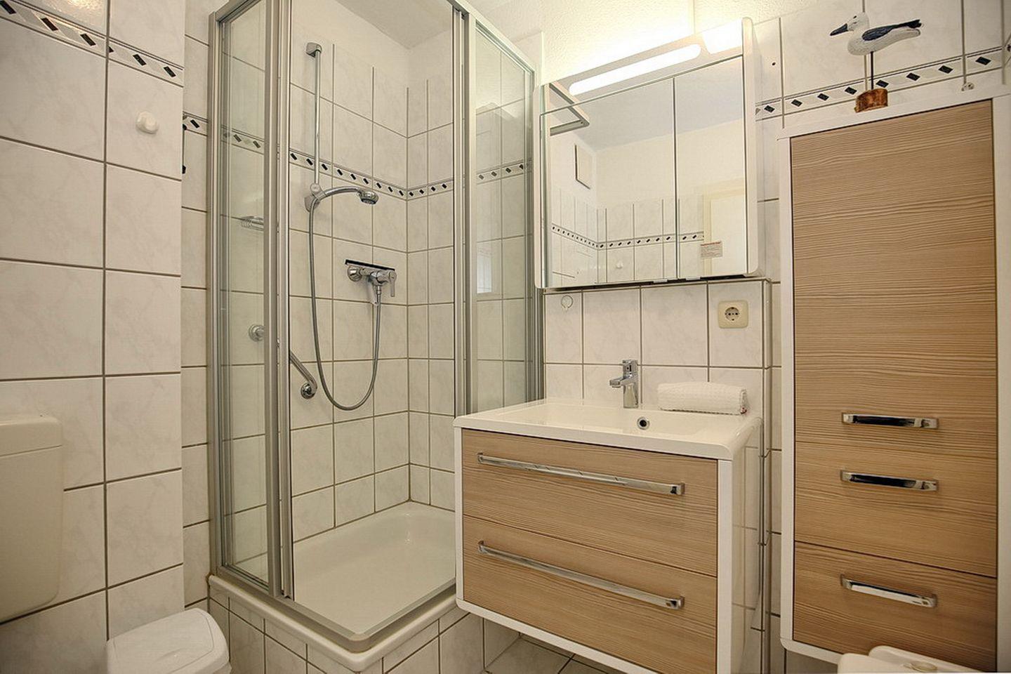 Das Duschbad ist gefliest. In dieser Nichtraucherwohnung sind keine Haustiere erlaubt.