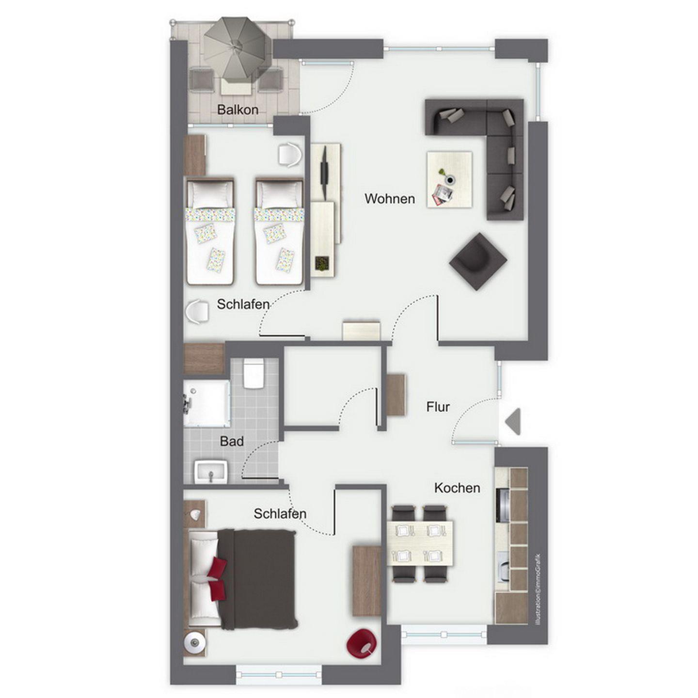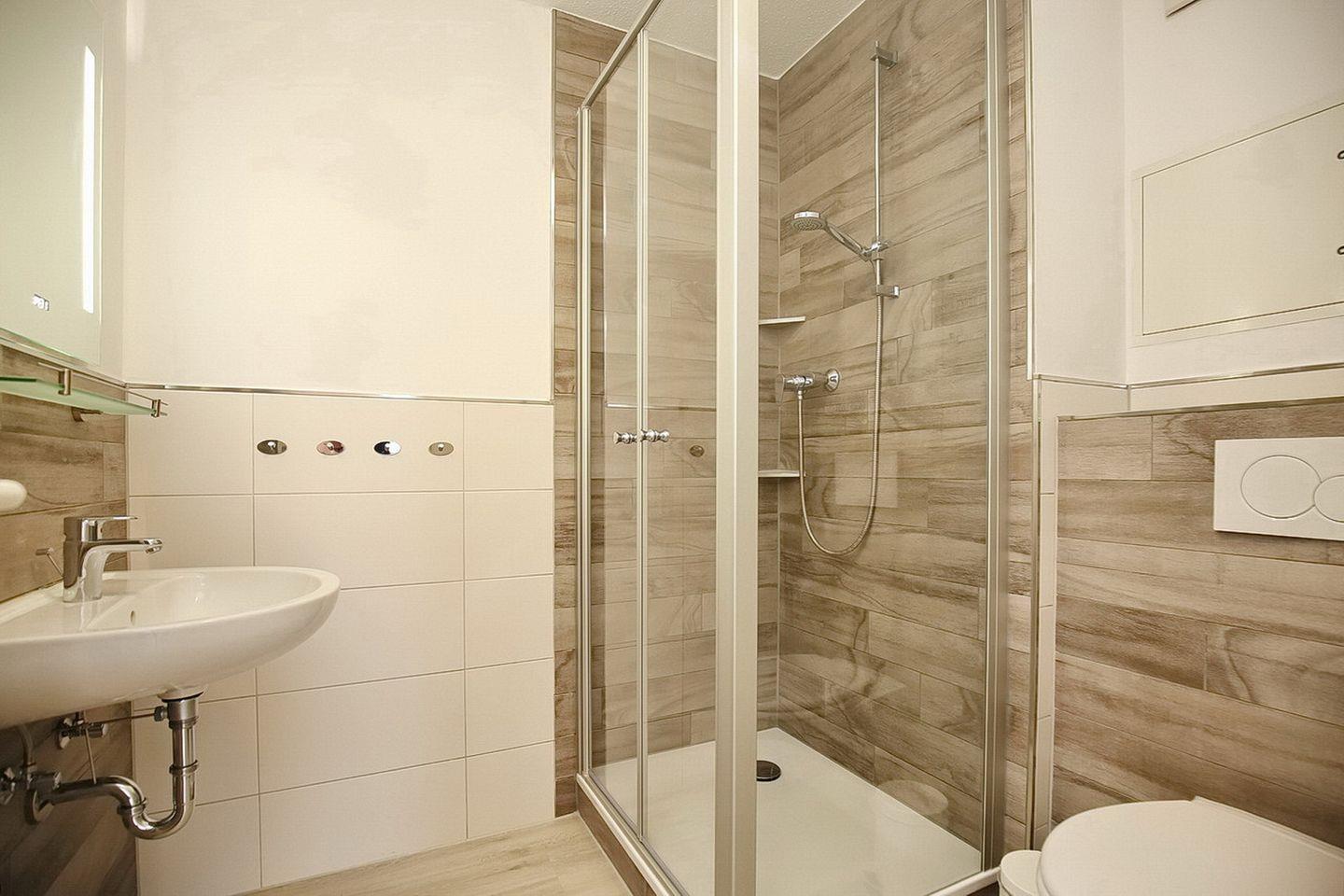 Zur Wohnung gehören weiterhin ein Duschbad/WC, 2 Abstellräume sowie ein Kfz-Stellplatz.