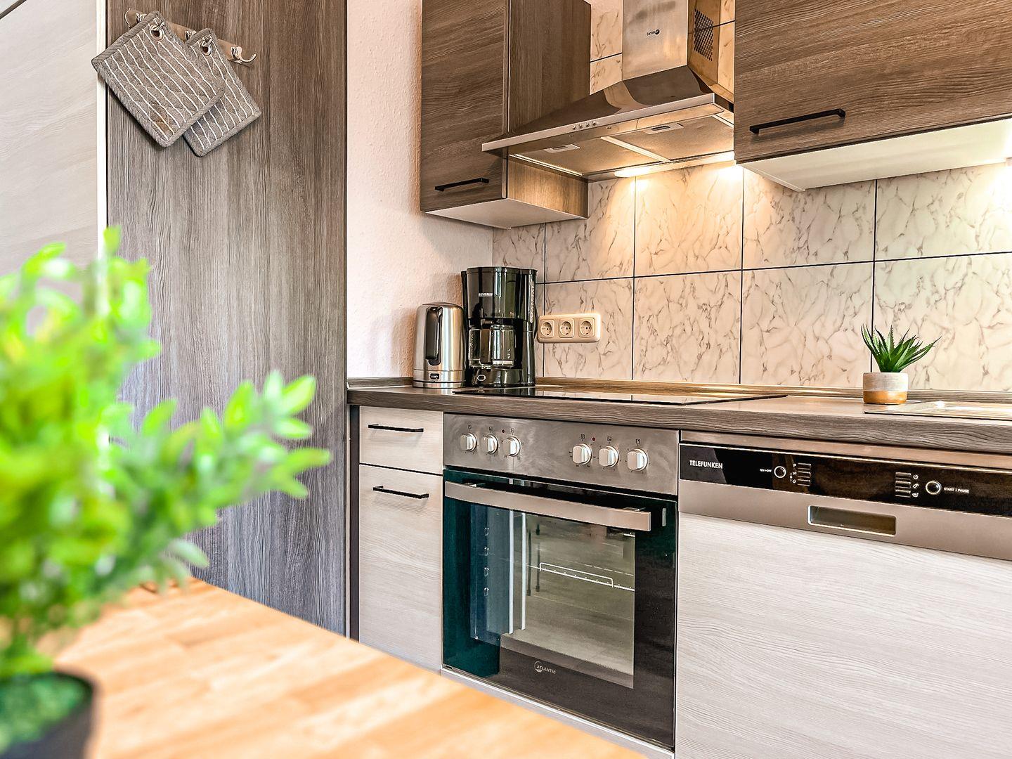 Zur Wohnung gehört ein Wohnzimmer, zwei Schlafzimmer, eine separate, voll ausgestattete Küche mit Essbereich, Geschirrspüler und Mikrowelle sowie ein Duschbad.