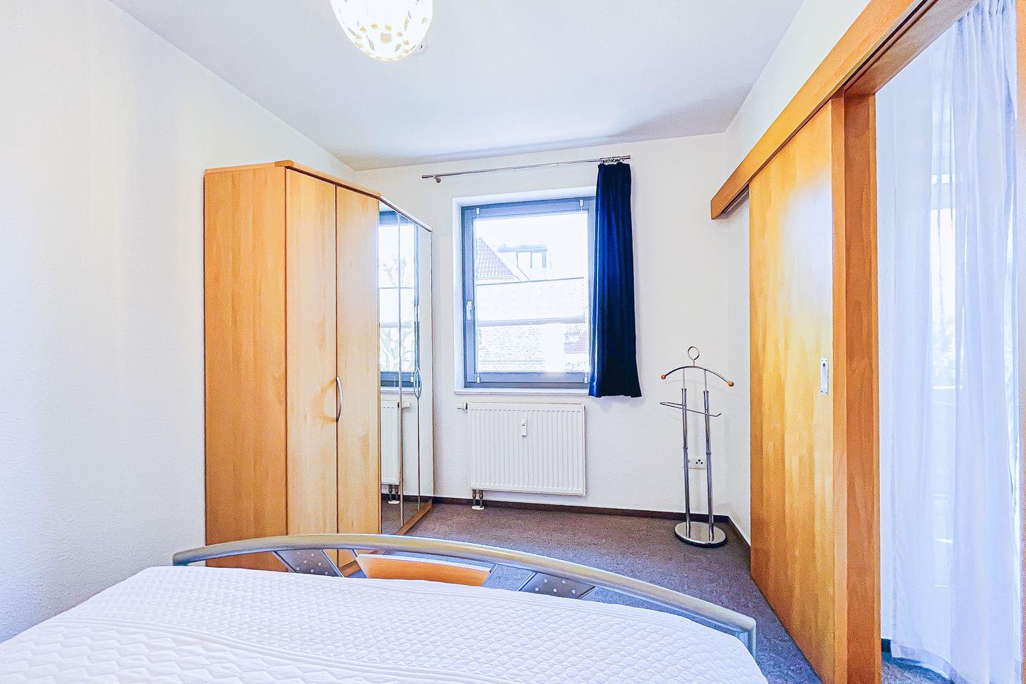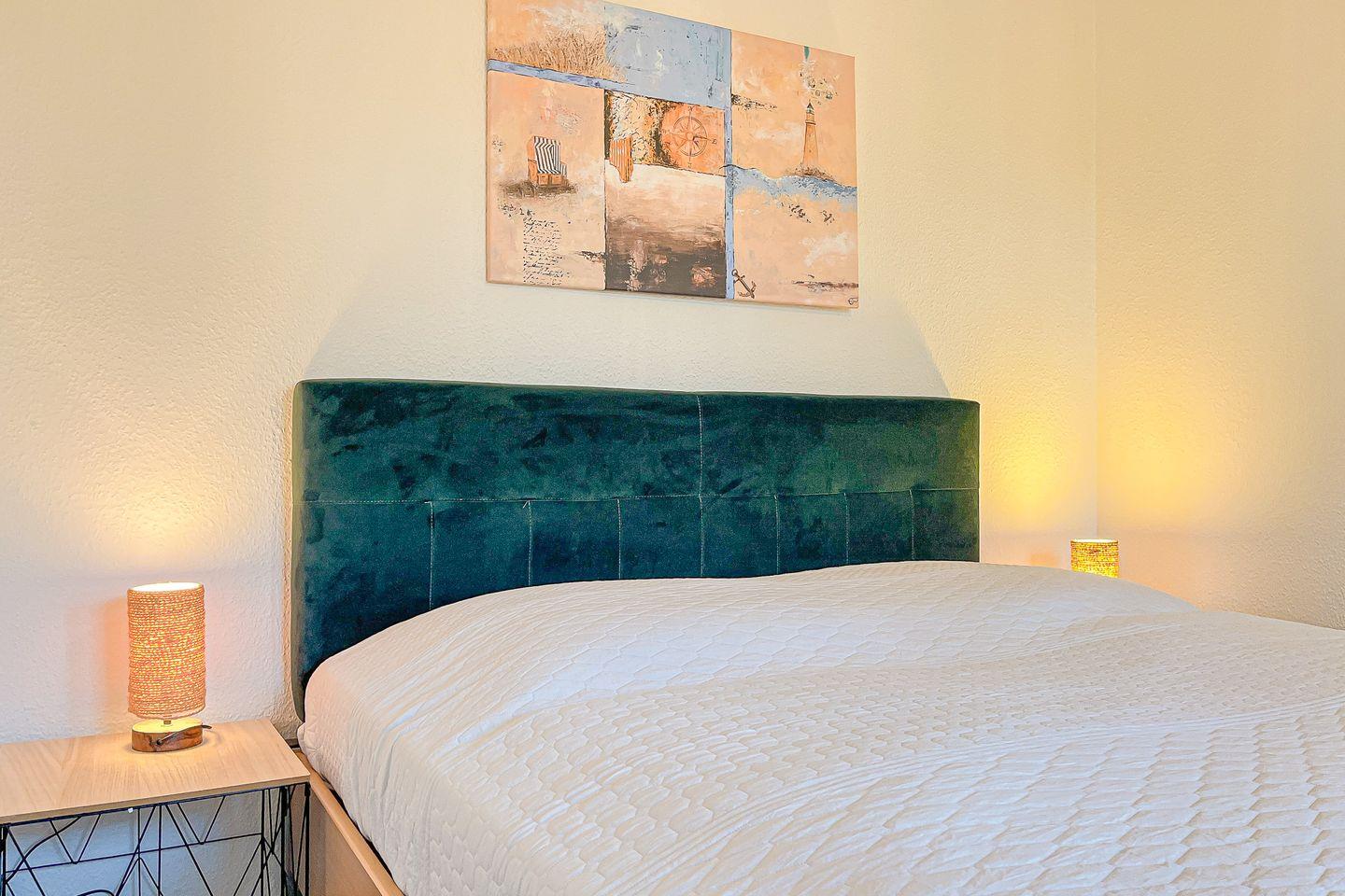 Im Schlafzimmer befindet sich ein Doppelbett (2 x 90 x 200 cm) sowie ein 2-türiger Kleiderschrank, der viel Platz für deine Urlaubsbekleidung bietet. Mit Teppichboden ist dieser Raum ausgelegt. An den Fenstern dienen Vorhänge zur Verdunkelung.