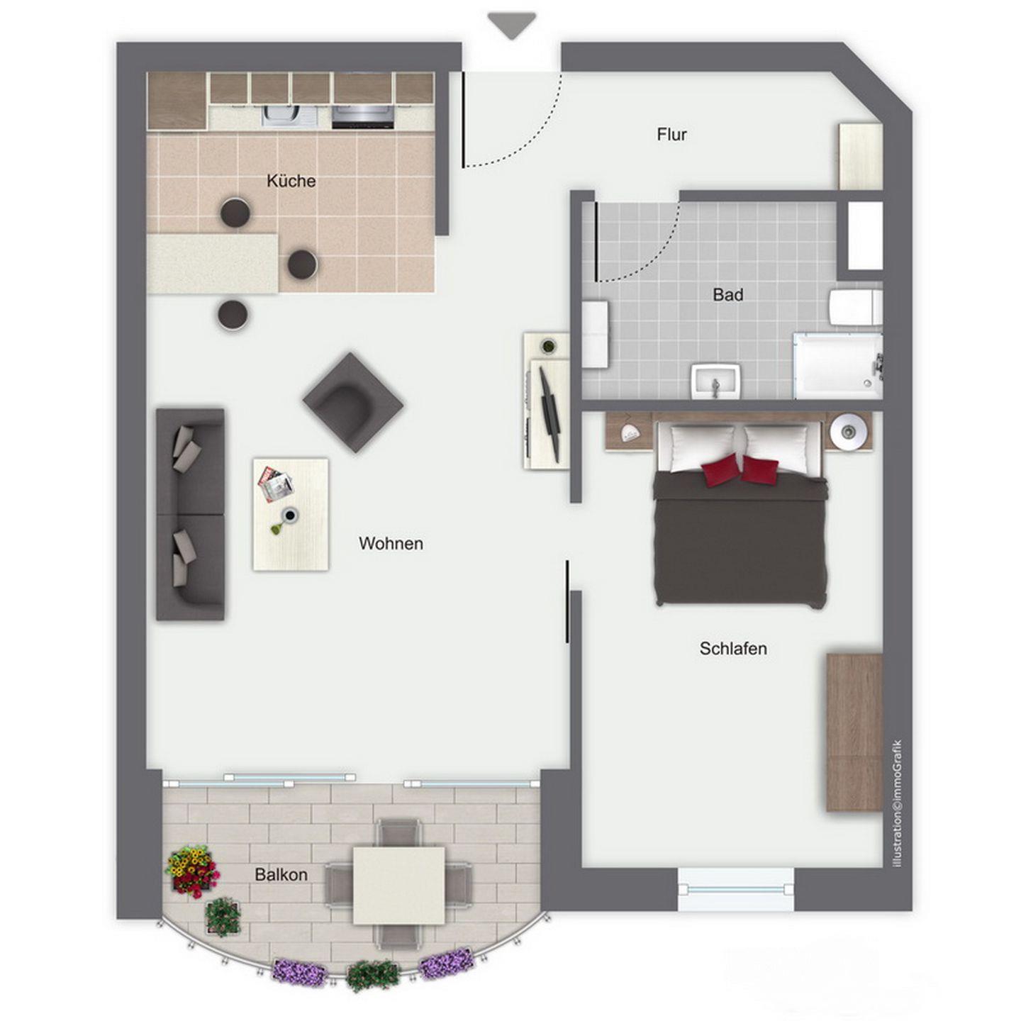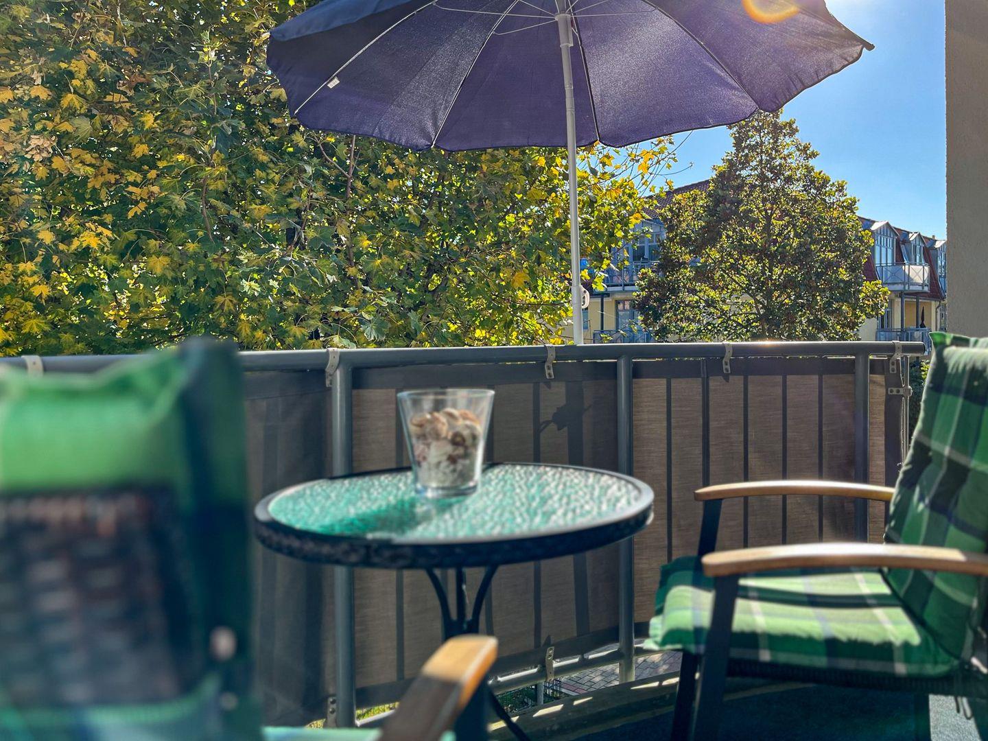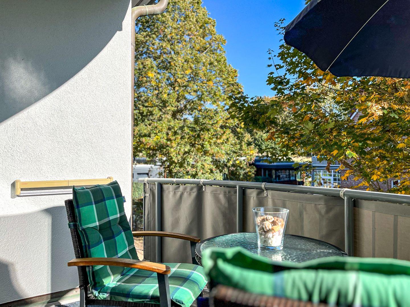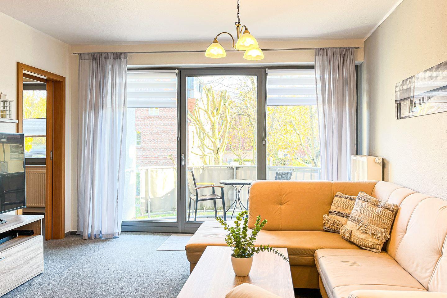Das lichtdurchflutete Wohnzimmer ist mit Teppichboden ausgelegt und verfügt über einen modernen DVD-Player mit einer Stereoanlage und einen TV/Flatscreen. In der gemütlichen Sitzecke lässt es sich hervorragend relaxen. Direkt vom Wohnzimmer gelangst du auf den möblierten, östlich ausgerichteten Balkon.