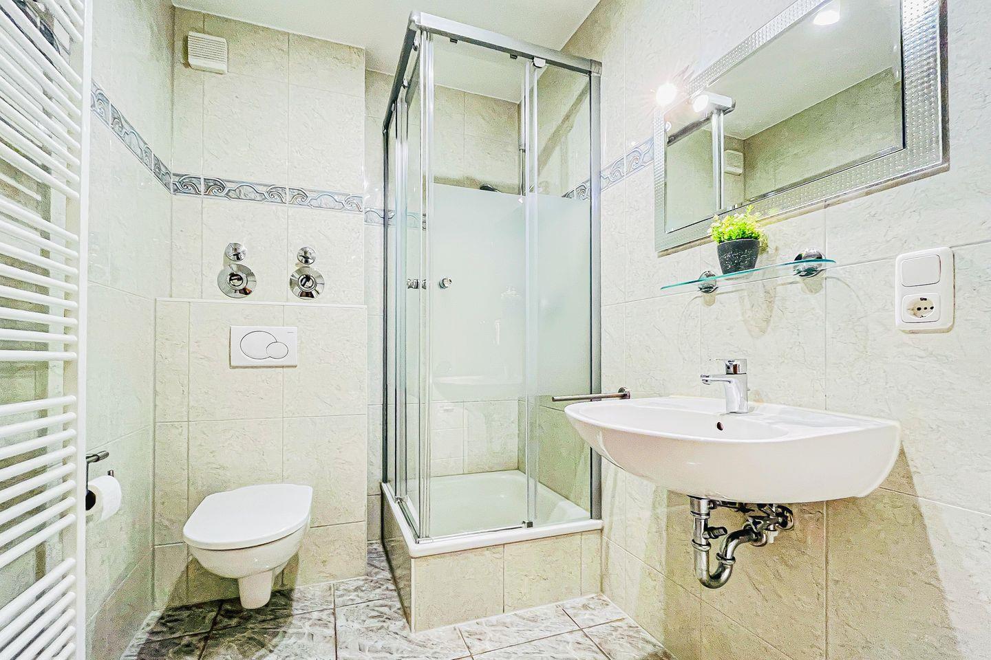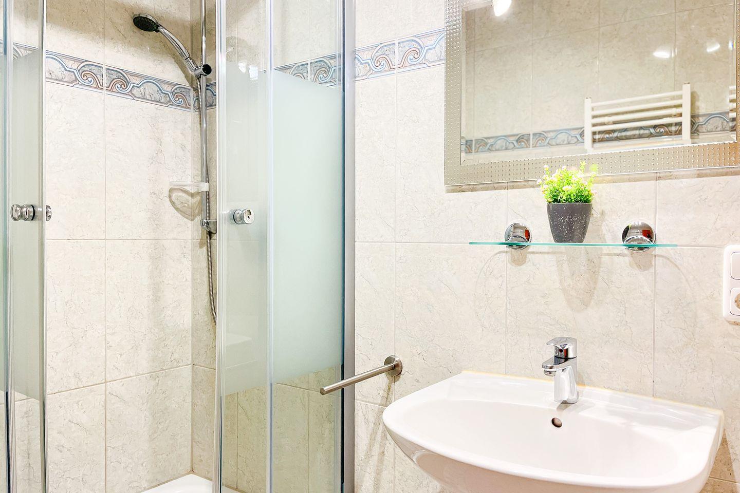 Selbstverständlich ist ein gefliestes Duschbad vorhanden. In dieser Ferienwohnung darf nicht geraucht werden und Haustiere sind auch nicht erwünscht.