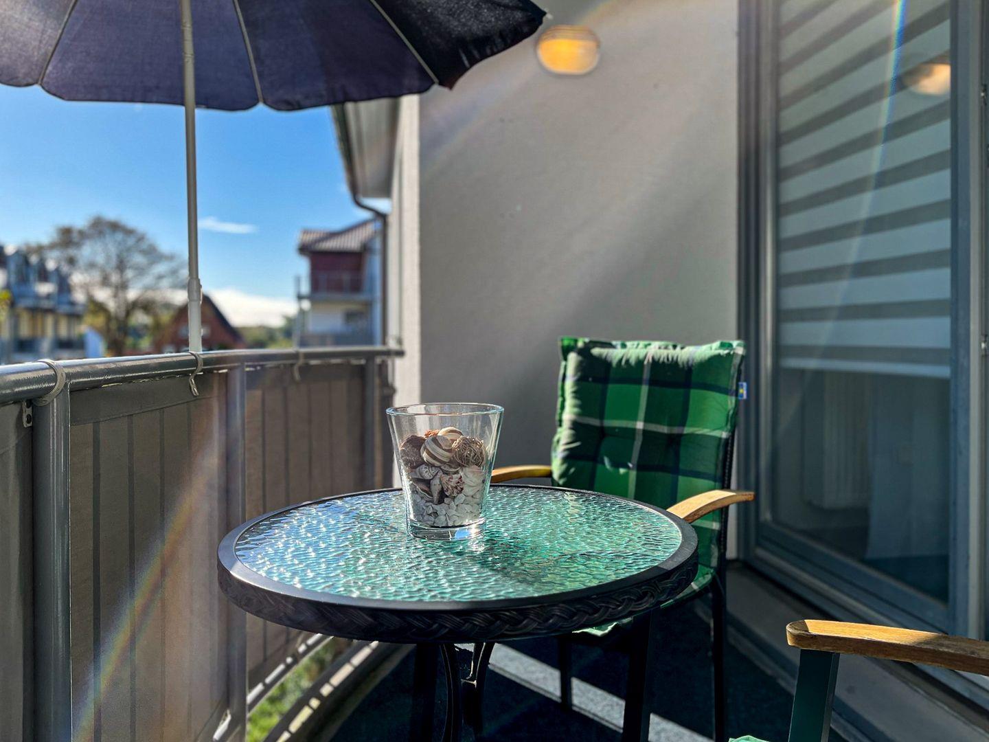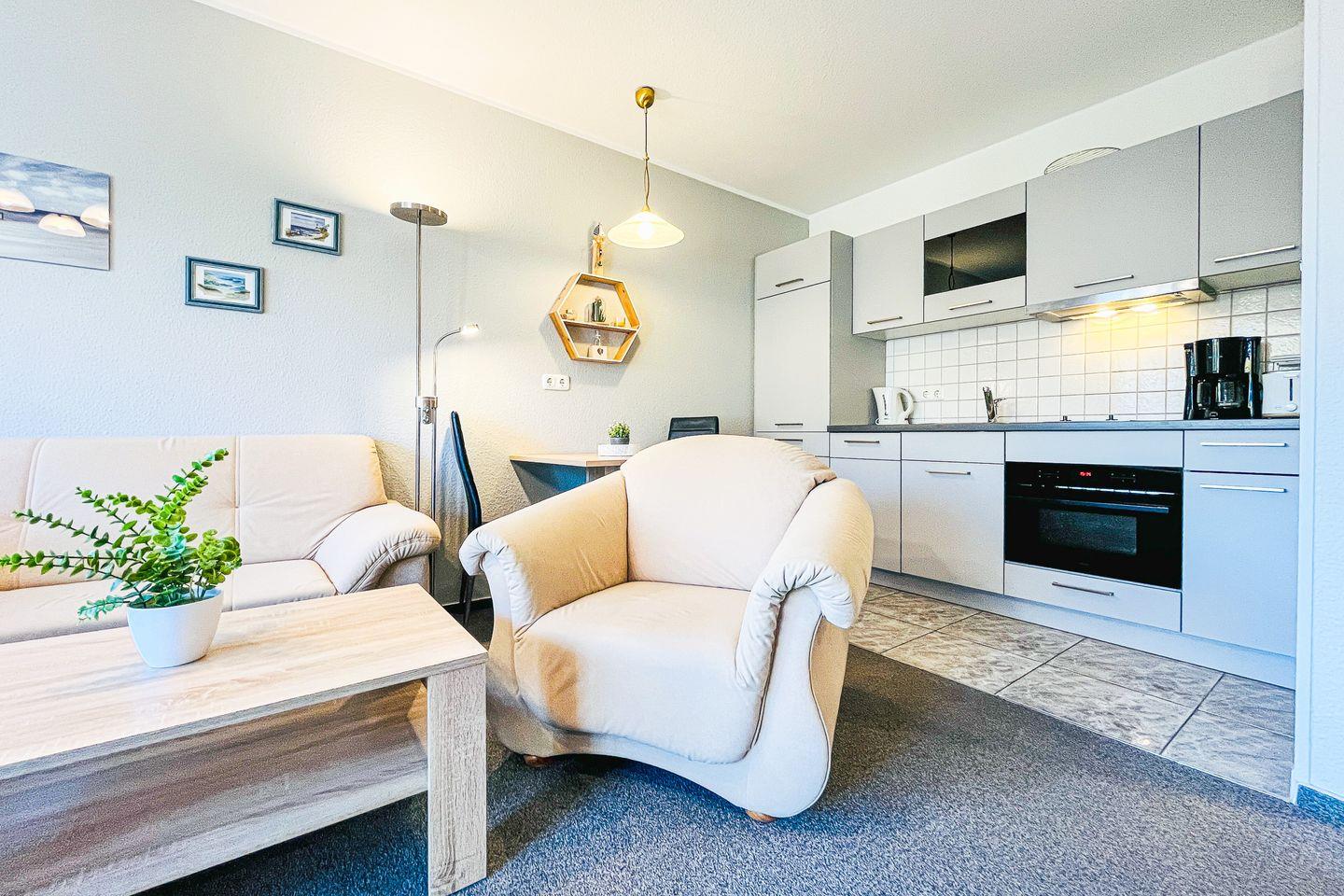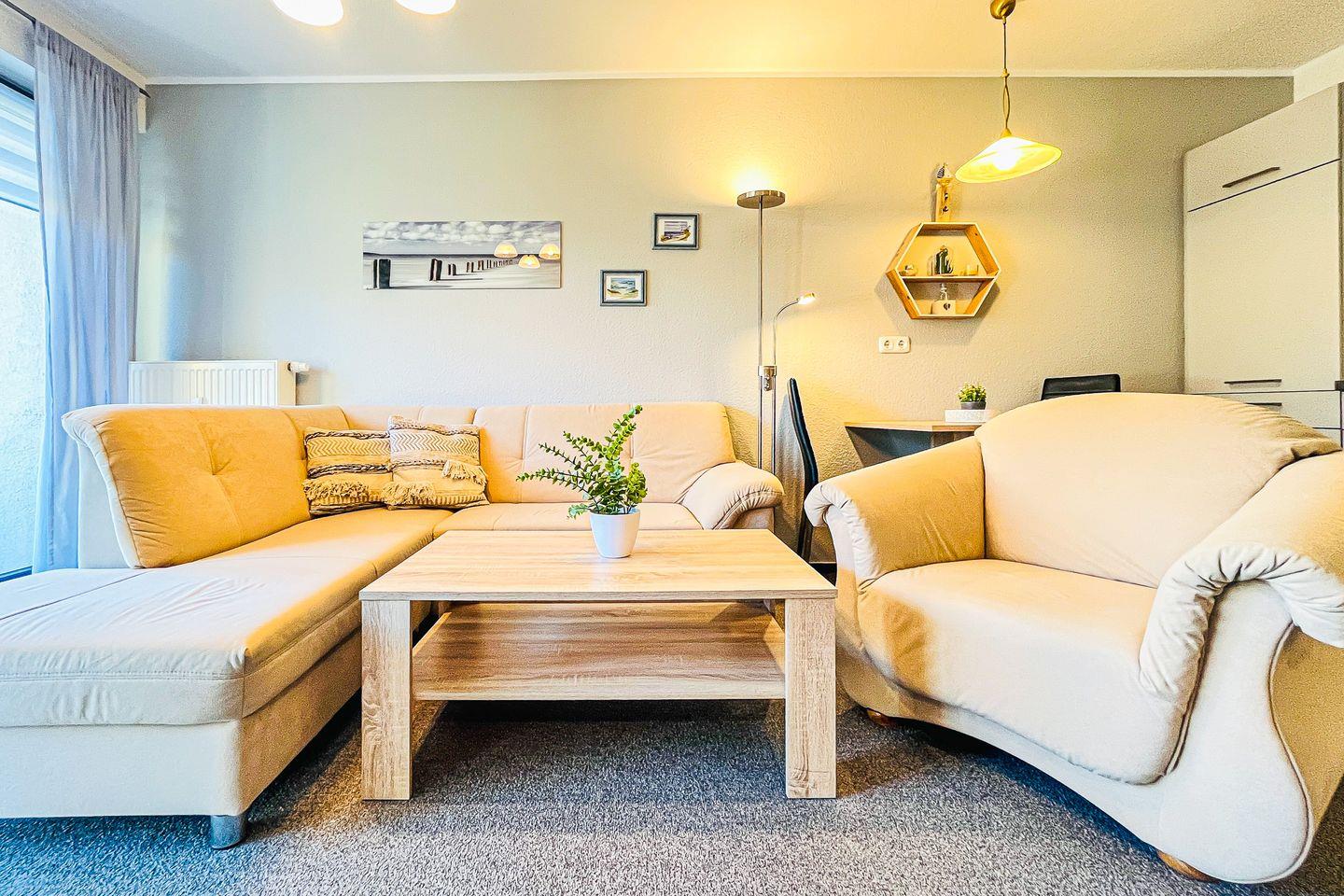Die gemütlich eingerichtete, ca. 40 m² große 2-Zimmer-Ferienwohnung im 1. Obergeschoss bietet ein Wohnzimmer mit Küchenzeile, ein Schlafzimmer, das Duschbad und einen östlich ausgerichteten Balkon. Die Strandentfernung beträgt ca. 60 Meter.