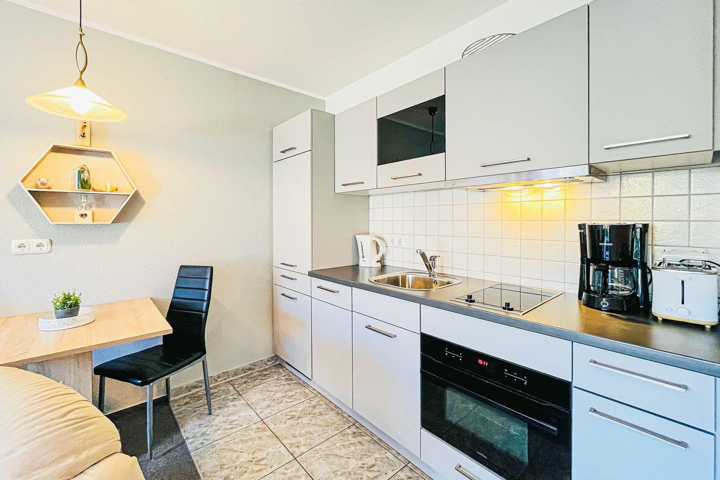 Die Küchenzeile ist in den Wohnbereich integriert und bietet einen Backofen mit integrierter Mikrowelle, ein 2-Platten-Cerankochfeld, Kühlschrank mit Gefrierfach und vieles mehr.
