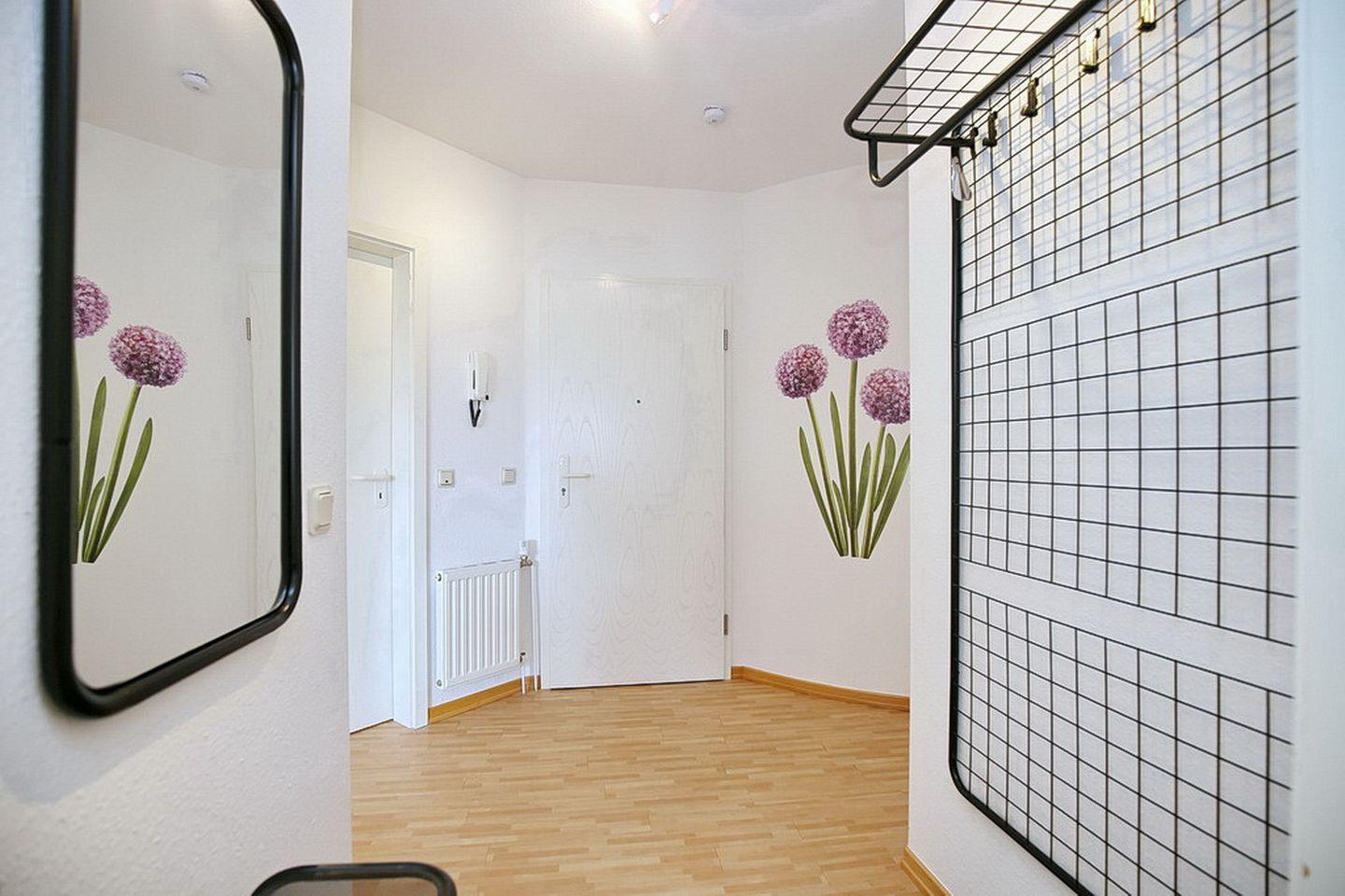 Die separate Küche ist ausgestattet mit einem Herd mit 4-Platten-Cerankochfeld, einem Backofen, Mikrowelle, Geschirrspüler und vielem mehr. Ein Duschbad gehört selbstverständlich zur Wohnung. Eine komfortable Waschmaschine ist bei einem längeren Aufenthalt angenehm. Auch ein Föhn ist vorhanden. Vor den Fenstern befinden sich Jalousien. Flur und Wohnzimmer sind mit Laminat ausgelegt, das Bad und die Küche sind gefliest. Bitte habe Verständnis, dass in dieser Wohnung nicht geraucht werden darf und Haustiere nicht erlaubt sind.