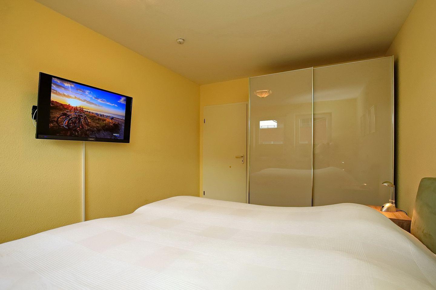 Im Schlafzimmer befindet sich ein bequemes Boxspringbett (2 x 90 x 200 cm) sowie ein zweiter Fernseher. In dem geräumigen 3-türigen Kleiderschrank findet deine Urlaubsgarderobe viel Platz.