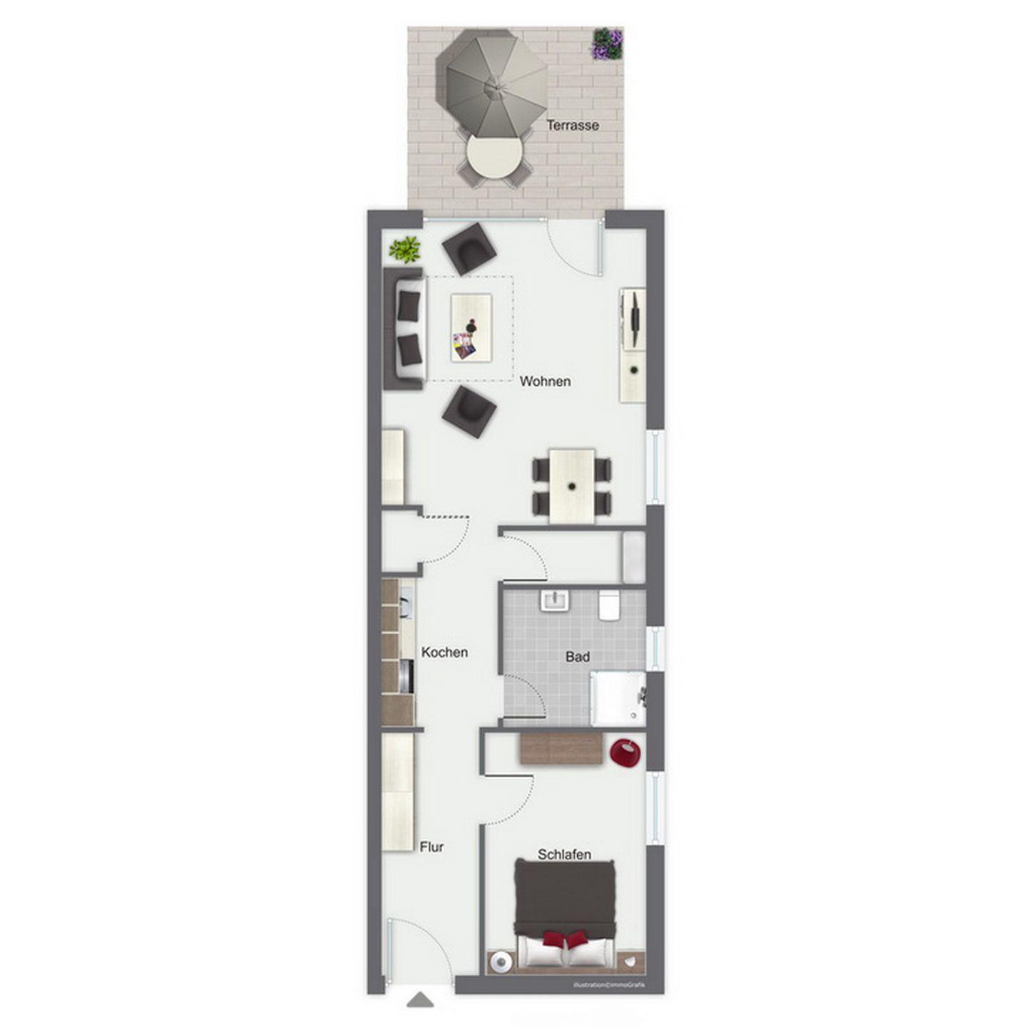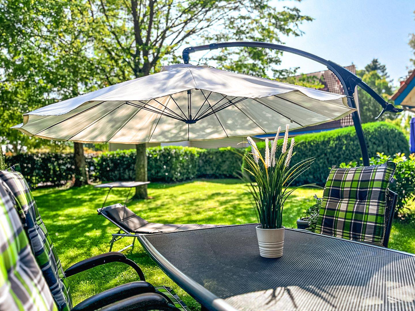 Aus deinem Wohnzimmer betrittst du die sonnig gelegene Terrasse, auf der du schöne Stunden im Freien verbringen kannst, hierfür steht dir eine Sonnenliege zur Verfügung. Von hier aus hast du direkten Zugang zur anschließenden Rasenfläche. Das Wohnzimmer ist mit einem Schlafsofa (160 x 200 cm), einer Kommode sowie einem Esstisch für 4 Personen eingerichtet. Zur Unterhaltung werden dir ein TV, eine Stereoanlage, Spiele und Bücher angeboten.