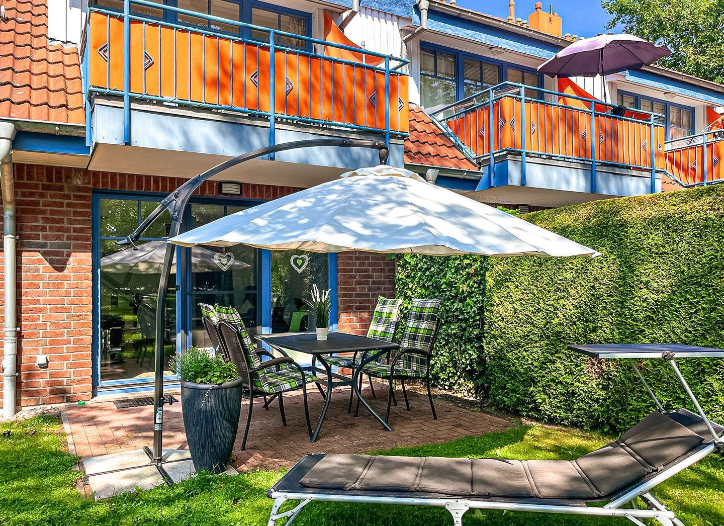 Am Ende des Hauses 15 befindet sich im Erdgeschoss das ruhig gelegene 2-Zi.-Appartement mit Terrasse in Süd-West Lage. Es ist ca. 55 m² groß und verfügt über einen Wohn- Essbereich, ein Schlafzimmer, eine Küchenzeile und ein Duschbad. Die Strandentfernung beträgt von der Ferienanlage Papillon ca. 250 m.