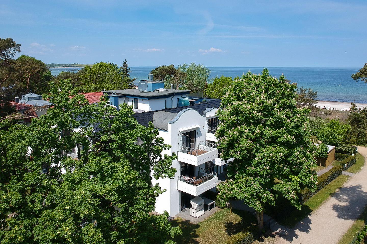 Sie befindet sich im Erdgeschoss und verfügt auf ca. 70 m² über ein Wohnzimmer, 2 Schlafzimmer, eine separate Küche, ein Duschbad, ein Gäste-WC sowie eine Terrasse in Richtung Süd-Ost. Die Strandentfernung beträgt nur ca. 25 Meter.