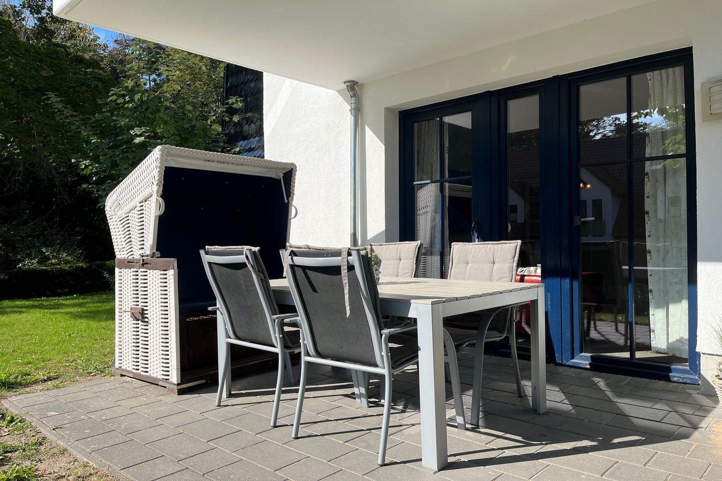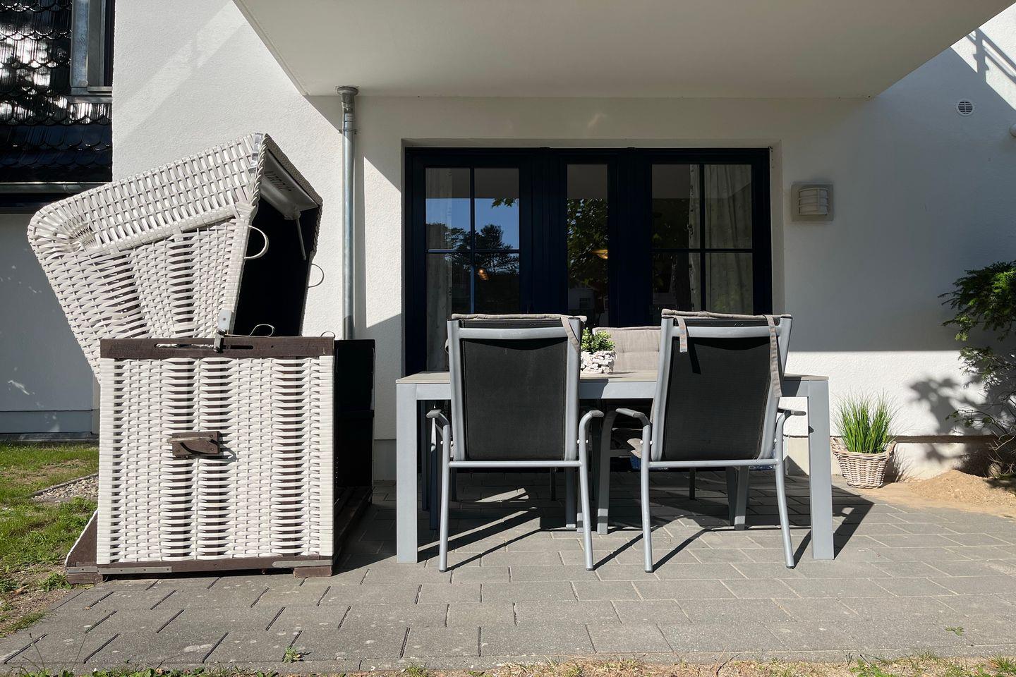Das Wohnzimmer ist modern und geschmackvoll eingerichtet. Ein großer Flachbildfernseher sowie eine Stereoanlage sorgen für Kurzweil an Regentagen. Durch das kostenlose WLAN (ohne Gewähr) verpasst du auch im Urlaub nichts. Auch ein gemütlicher Essplatz für 4 Personen befindet sich hier. Auf die süd-östlich ausgerichtete Terrasse, die mit bequemen Terrassenmöbeln, u.a. einem Strandkorb, ausgestattet ist, gelangst du direkt vom Wohnzimmer.