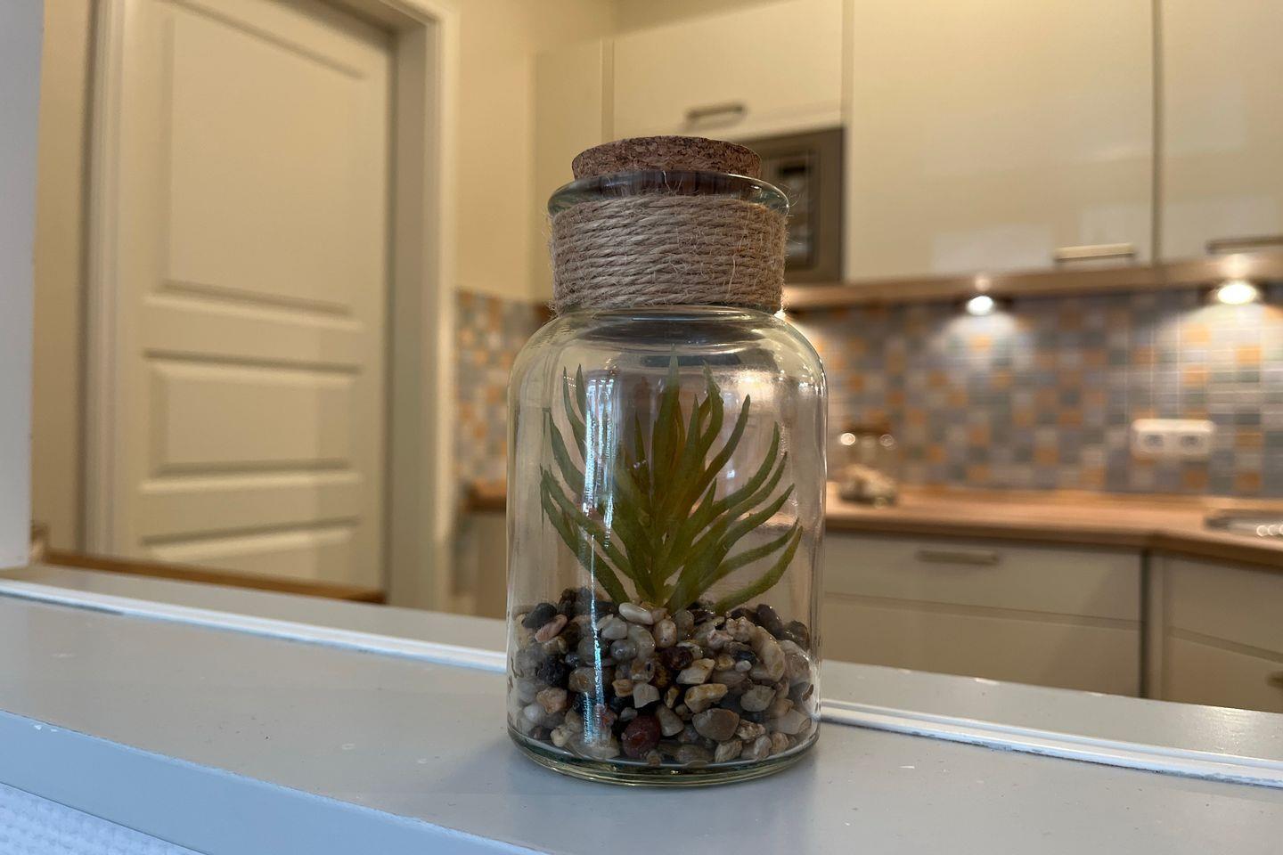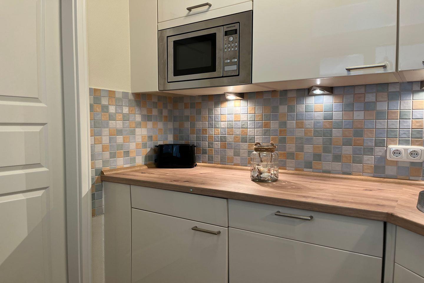 Hochwertig ausgestattet, mit allem Komfort, ist die Küche der Ferienwohnung. Sie verfügt u.a. über einen Geschirrspüler, einen Herd mit Backofen und einem 4-Platten-Cerankochfeld, einen Kühlschrank mit Gefrierfach, eine Mikrowelle und vieles mehr. Auf der Terrasse kannst du den vorhandenen Elektrogrill (Tischgrill) ausgiebig nutzen.