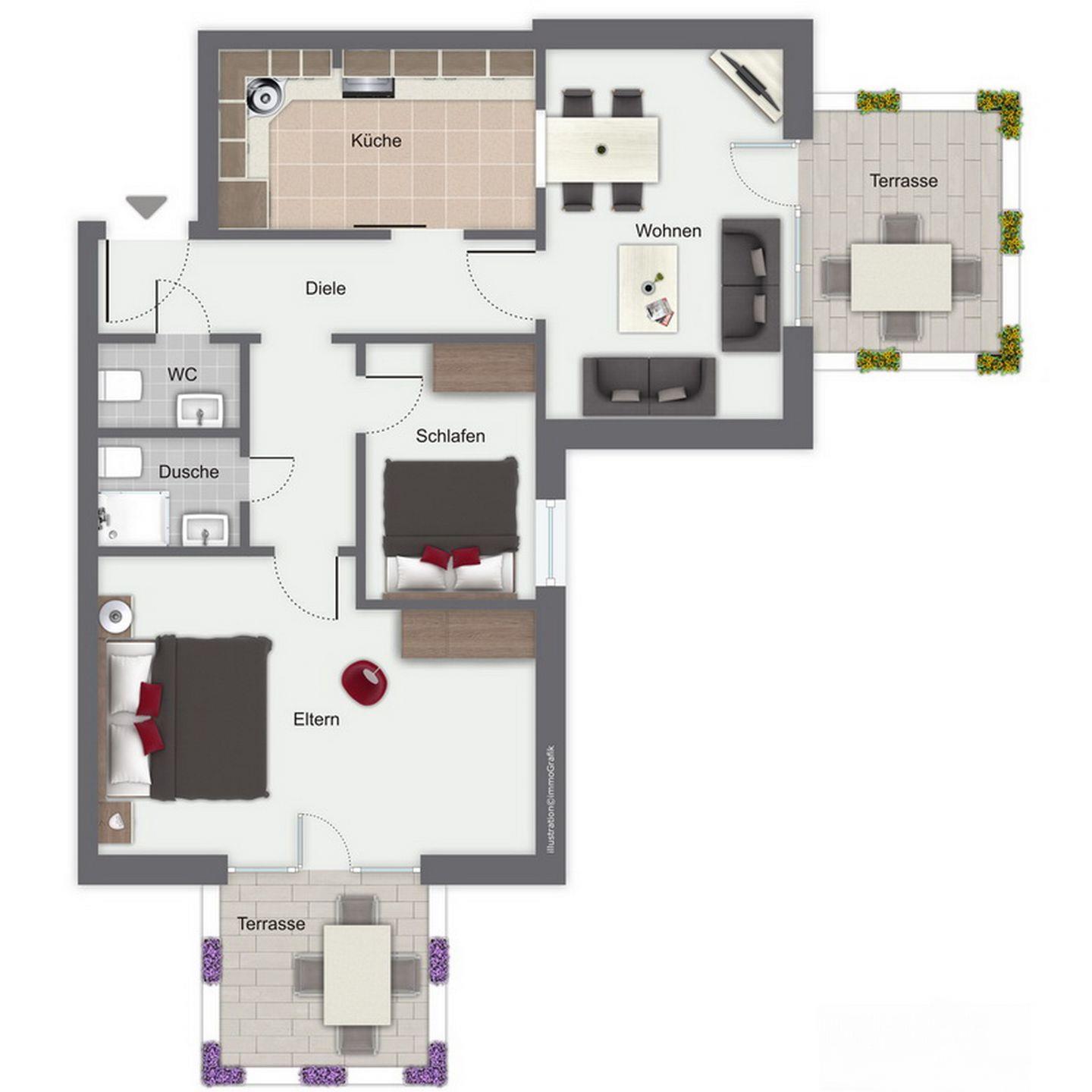 In einem der beiden Schlafzimmer steht ein Doppelbett (2 x 90 x 200 cm) für dich bereit. Das Doppelbett im 2. Schlafzimmer hat eine Liegefläche von 2 x 80 x 200 cm. Viel Platz für deine Urlaubsgarderobe bieten die 2-türigen Kleiderschränke in den Schlafzimmern dieser Ferienwohnung. In beiden Schlafzimmern dienen Vorhänge zur Verdunklung.