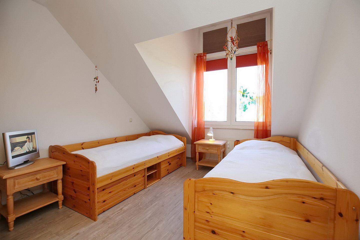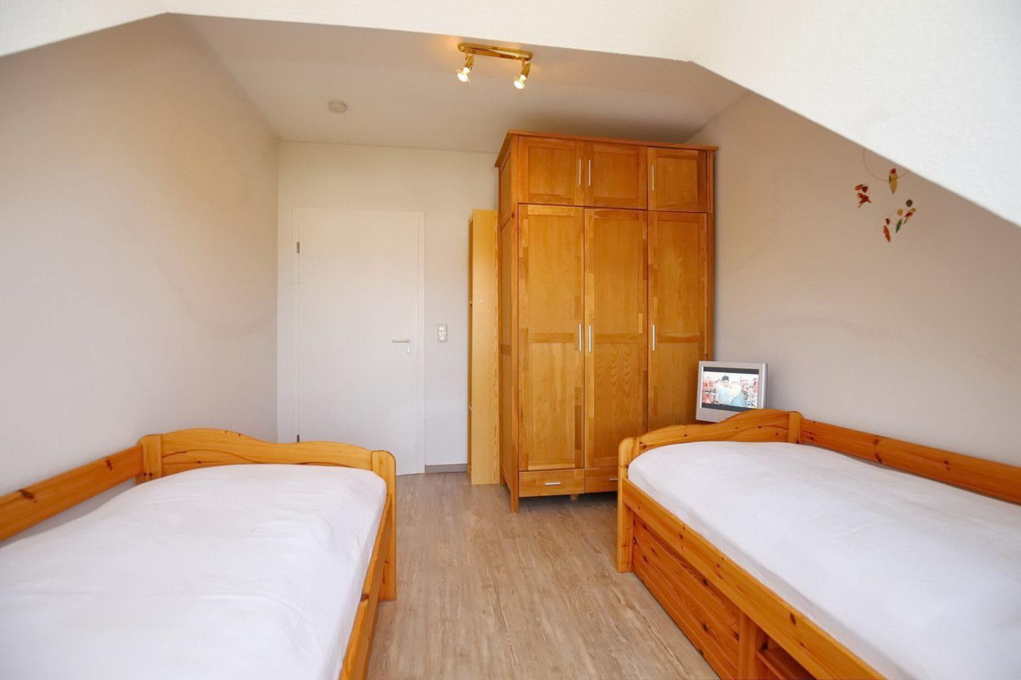 Im ersten Schlafzimmer mit einem 2. TV bietet ein Doppelbett (2 x 90 200 cm) erholsamen Schlaf. Das zweite Schlafzimmer ist ebenfalls mit einem TV und zwei Einzelbetten (80 x 200 cm) möbliert. In beiden Räumen bieten zwei Kleiderschränke ausreichend Ablagemöglichkeiten für die Urlaubsgarderobe. An den Fenstern gibt es Vorhänge und Plissees zur Verdunkelung. Im Wohn- und Schlafbereich ist der Bodenbelag Laminat.