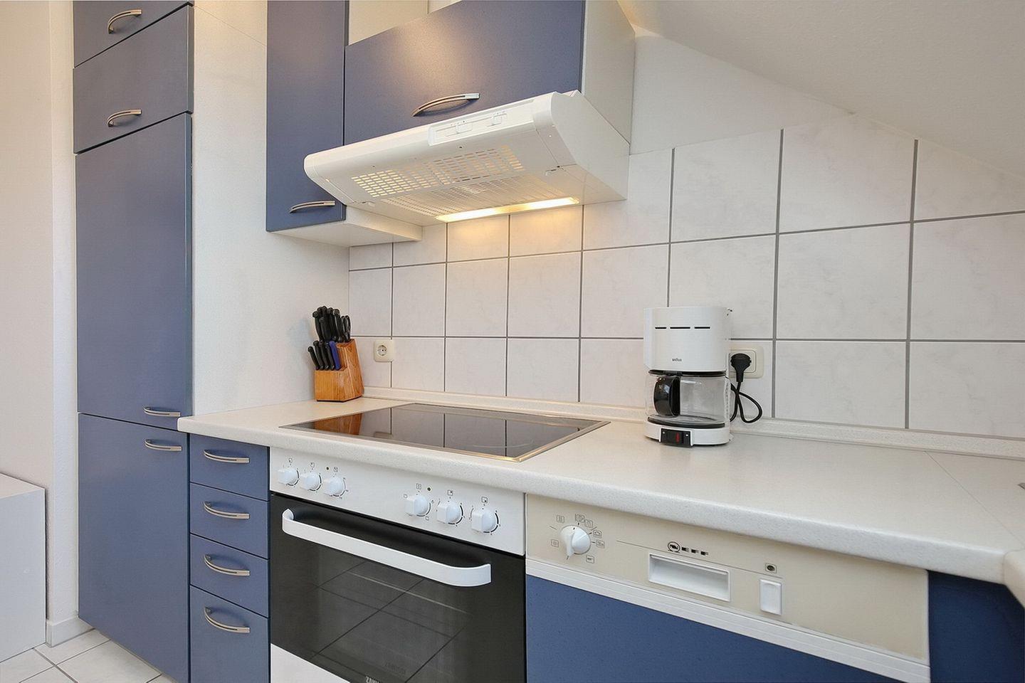 In der voll ausgestatteten, separaten Küche befinden sich ein Kühlschrank mit Gefrierfach, ein Geschirrspüler, eine Mikrowelle und ein Cerankochfeld mit Backofen. Eine Waschmaschine steht ebenfalls zur Verfügung.