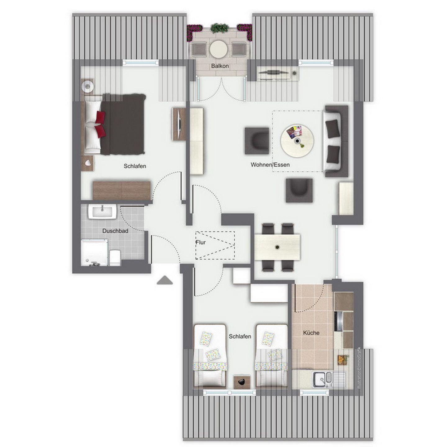 Deine Wohnung im freundlichen Landhausstil befindet sich im 2. Obergeschoss. Auf ca. 68 m² kannst du und bis zu drei weitere Personen über einen Wohn- /Essbereich, zwei Schlafzimmer, eine separate Küche, ein Duschbad und einen Balkon verfügen.