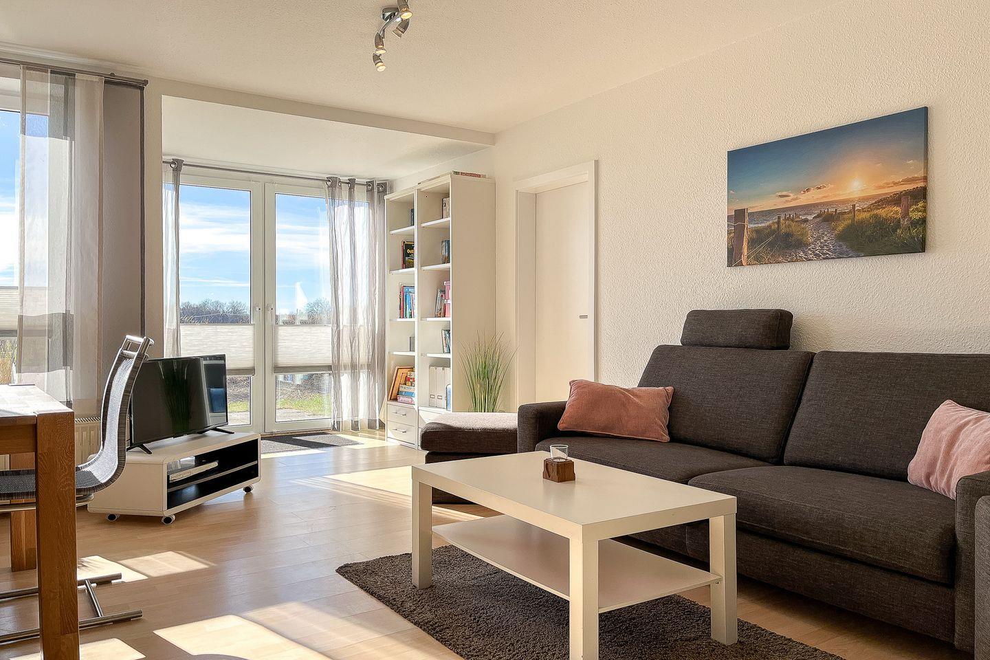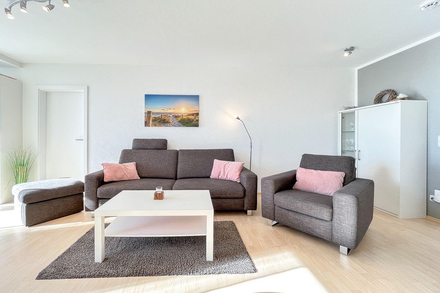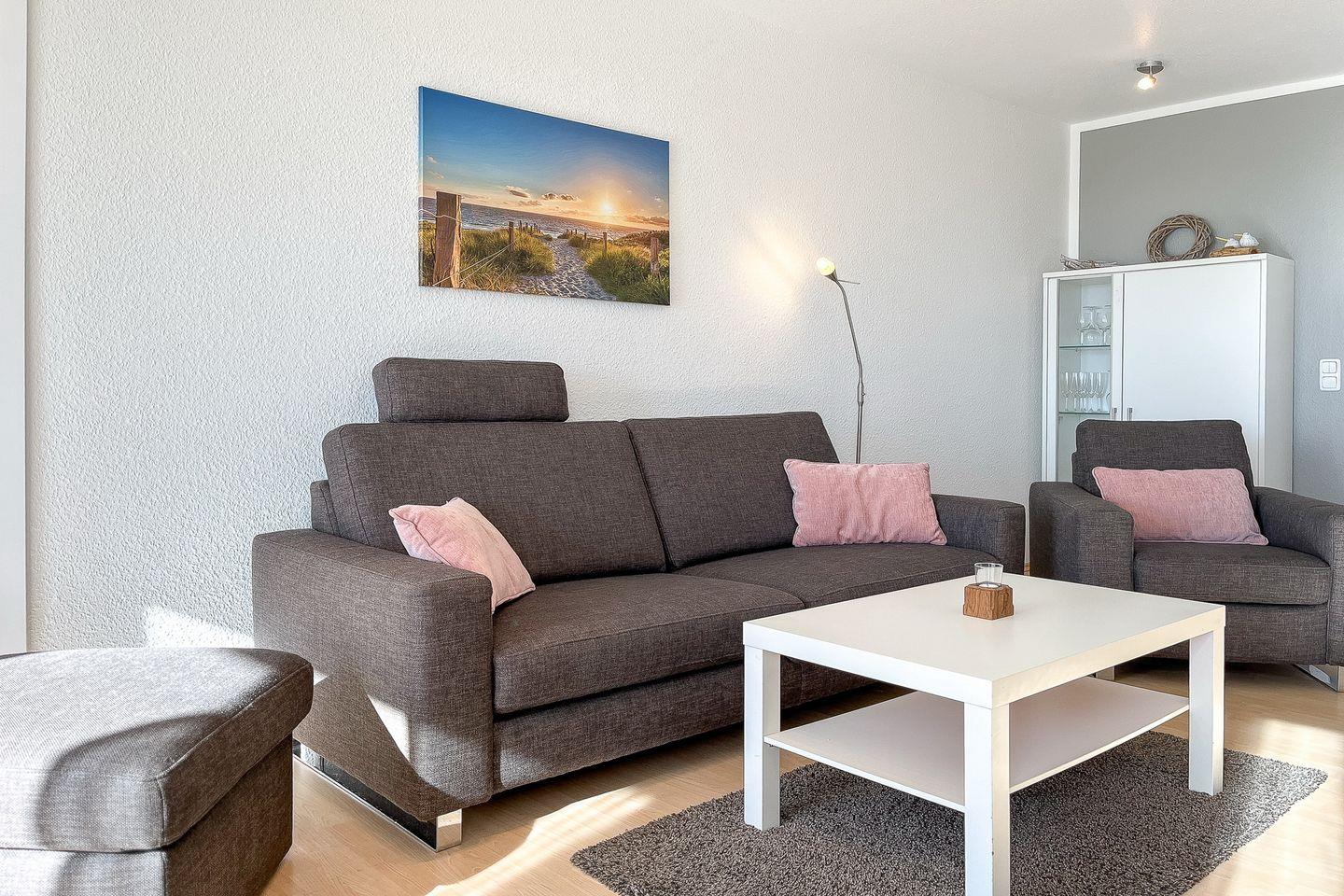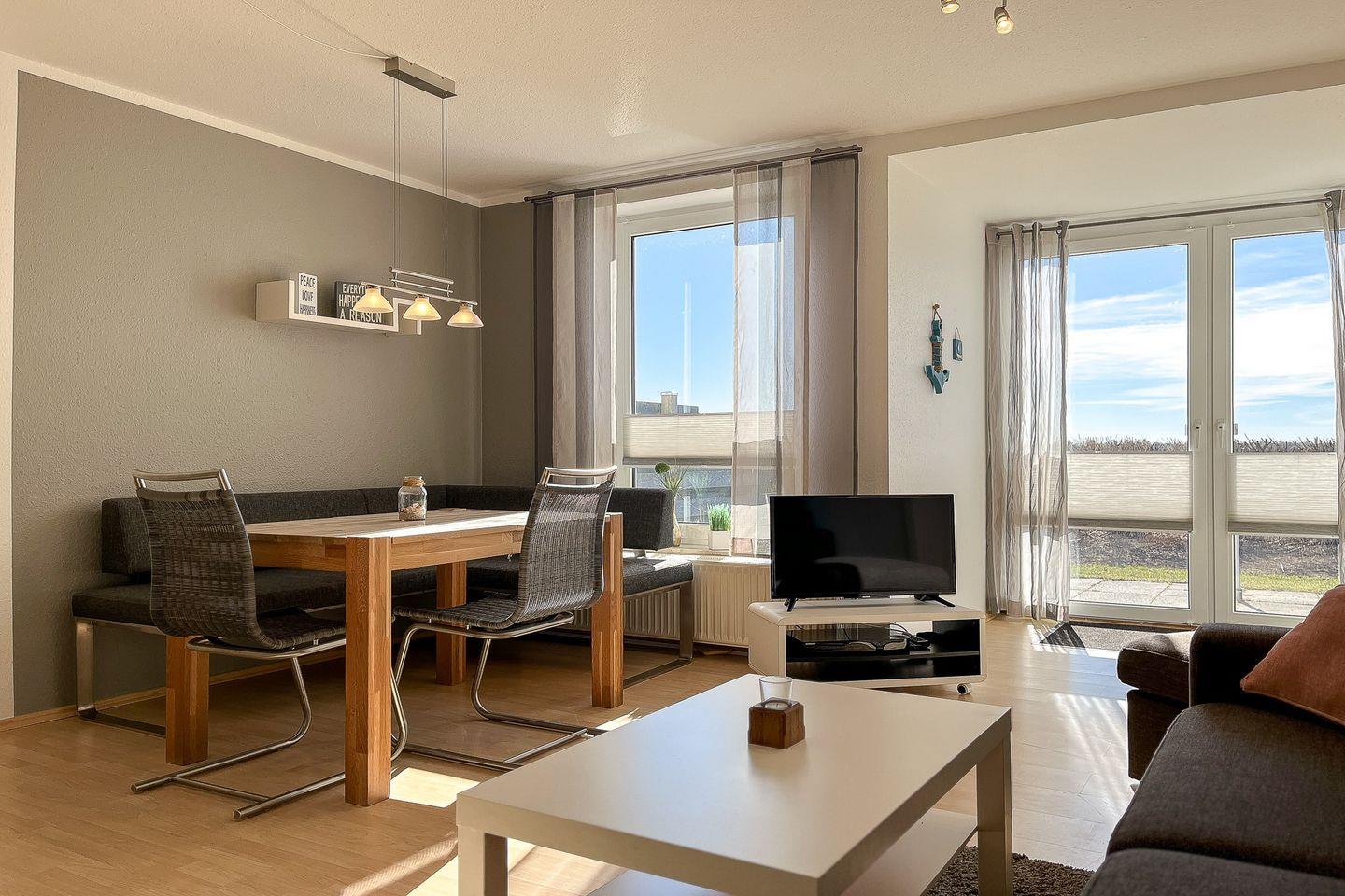Dieses freundliche und mit Liebe zum Detail eingerichtete 3-Zi.-Appartement lädt dich auf unbeschwerte Urlaubstage ein. Die ca. 64 m² Erdgeschosswohnung mit Terrasse in sonniger Süd-Lage bietet Platz für bis zu 4 Personen. Die Wohnung hat einen Wohn- und Essbereich, zwei Schlafzimmer, eine Küchenzeile und ein Duschbad. Die Entfernung zum Strand beträgt von der Anlage Sünnslag ca. 400 m.