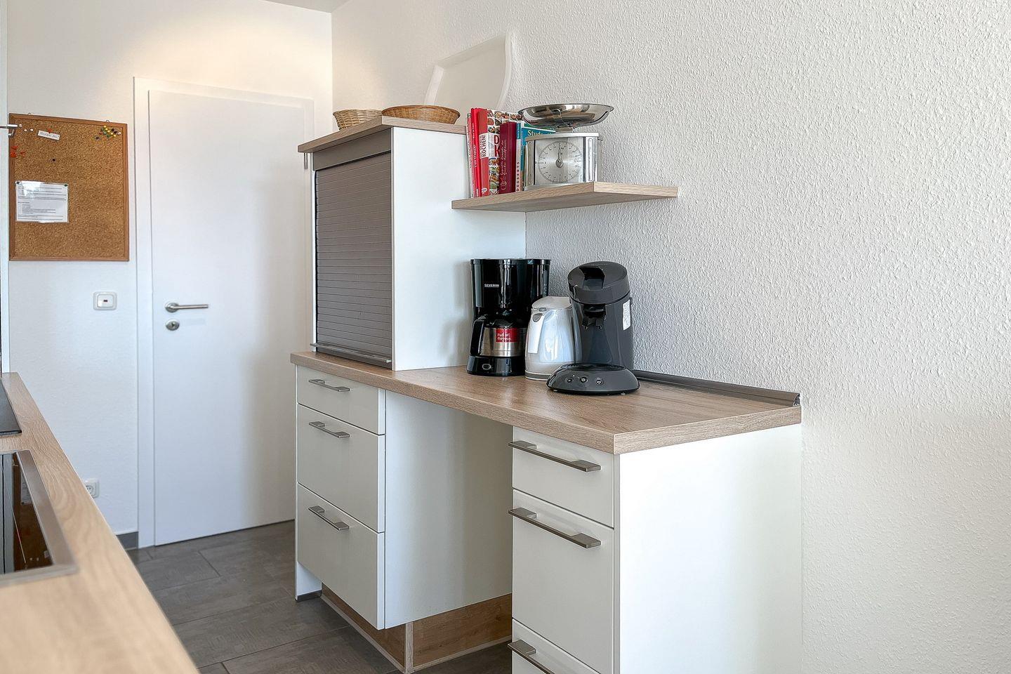 Die hochwertige Küchenzeile ist vollständig ausgestattet mit einem Cerankochfeld mit Backofen, einer Mikrowelle, einer Senseo- sowie einer Filter-Kaffeemaschine, einem Kühlschrank mit Gefrierfach und einer Geschirrspülmaschine. Für kleine Gäste stehen ein Kinderreisebett mit Matratze, ein verstellbarer Hochstuhl, (Sand-)Spielzeug und eine Stranddecke bereit.