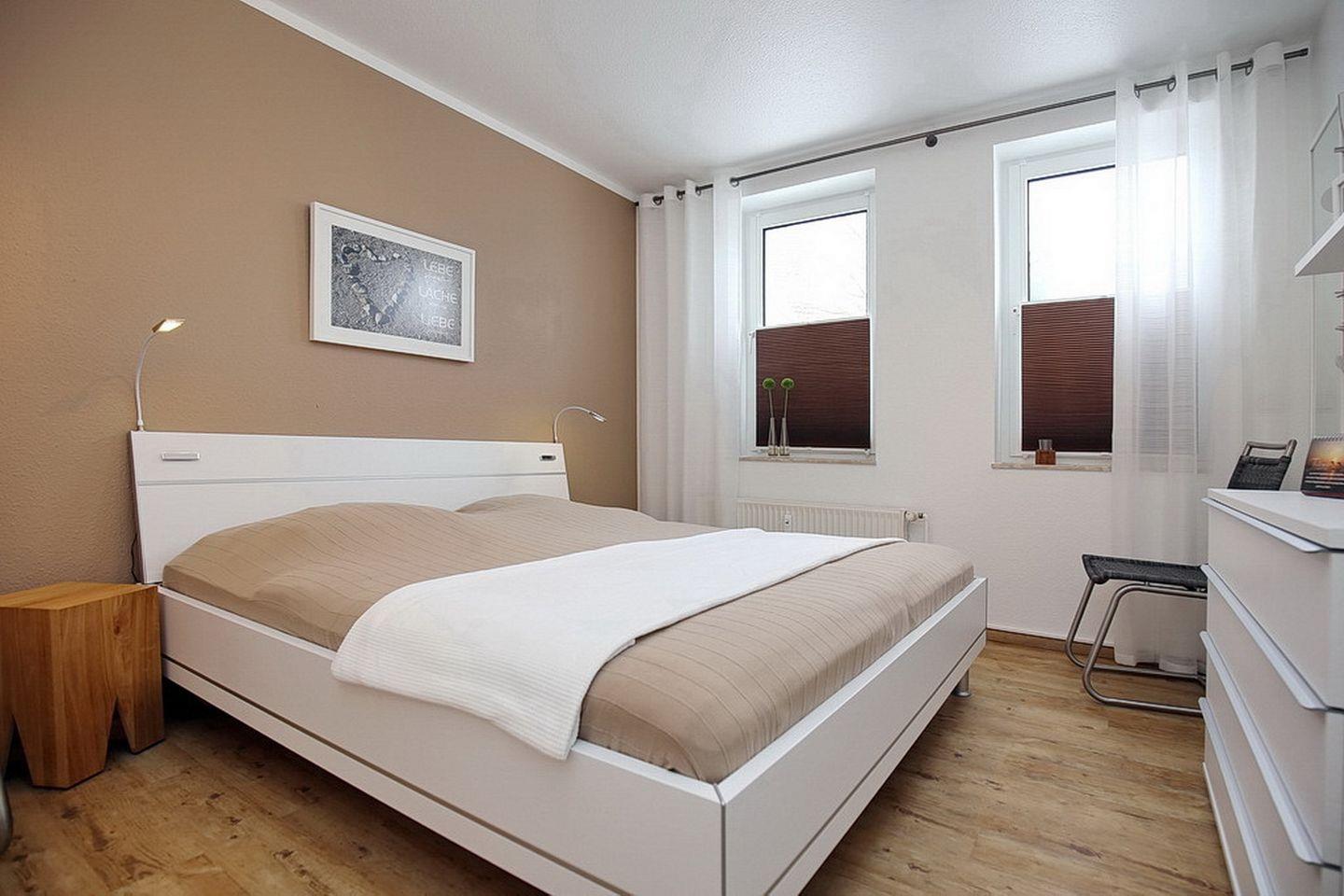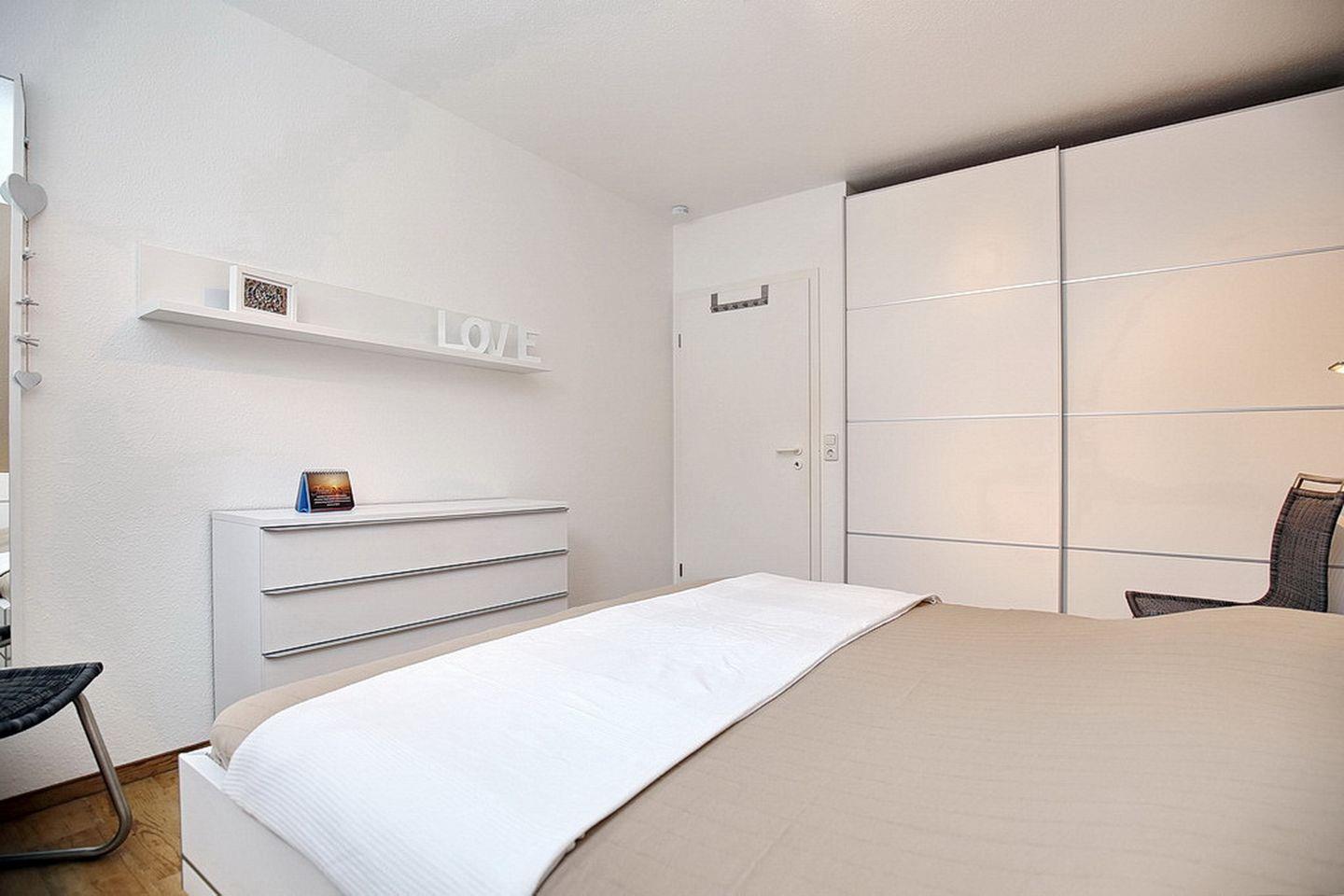 Das moderne Schlafzimmer schafft mit einem Doppelbett (2 x 90 x 200 cm) und einem Kleiderschrank eine wohnliche Atmosphäre. Ein weiteres Schlafzimmer mit Doppelbett (2 x 90 x 200 cm) und einem geräumigen Kleiderschrank schließt sich dem Wohnbereich direkt an. Als Bodenbelag wurde in beiden Schafzimmern Design-Belag verwendet. Die Fenster werden in beiden Schlafbereichen mit Plissees verdunkelt.