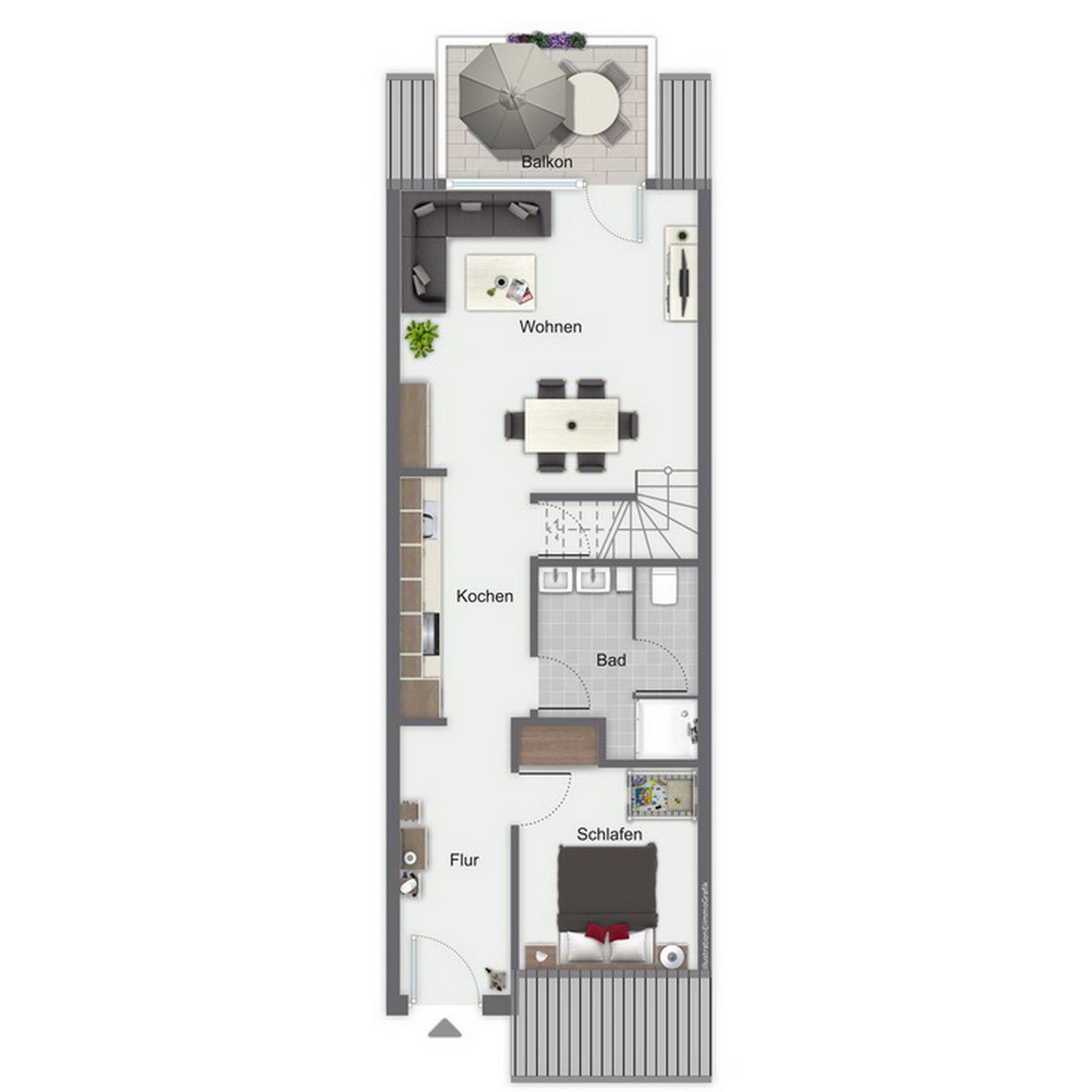 Betrete den möblierten und sonnigen Balkon über das Wohnzimmer. Im äußerst zeitgemäß eingerichteten Wohnraum befinden sich eine Wohnlandschaft und der moderne Esstisch. Im Wohnbereich sorgen ein Flachbild-TV, eine Stereoanlage sowie ein DVD-Player für deine Unterhaltung.