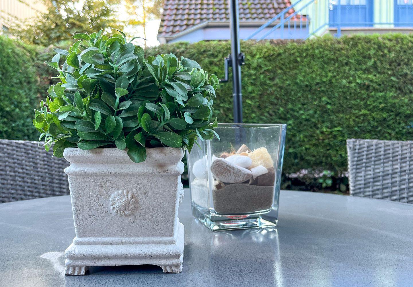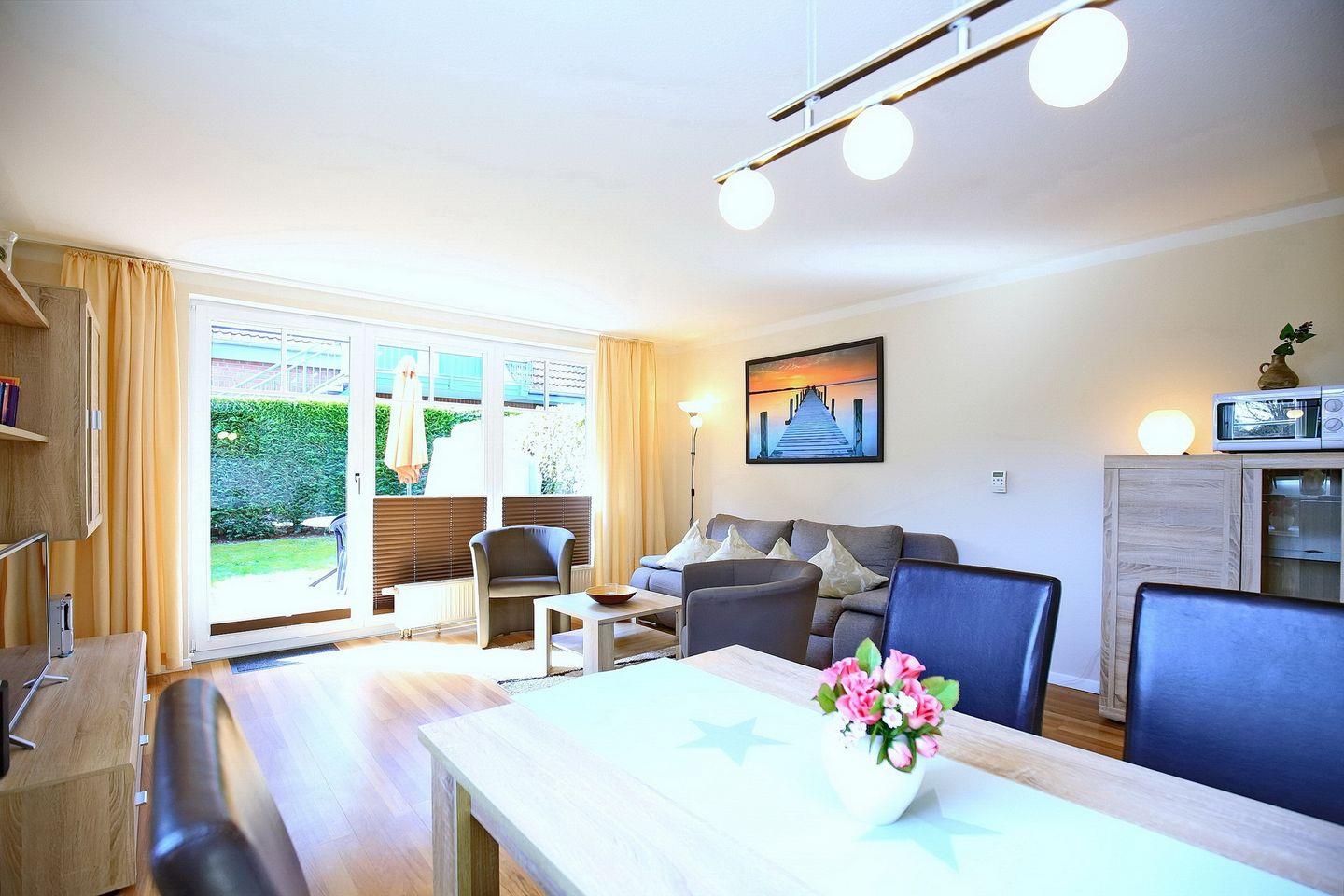 Die Terrasse mit Tisch, Stühlen und einem Strandkorb lädt bei schönem Wetter zum Relaxen ein. Diese erreichst du über den Wohnraum. Das geschmackvoll eingerichtete Wohnzimmer ist mit einem Sofa mit Schlaffunktion (150 x 200 cm) und einem Essplatz für 4 Personen möbliert. Damit keine Langweile aufkommt, findest du hier einen Flachbild-TV, eine Stereoanlage und einen DVD-Player.