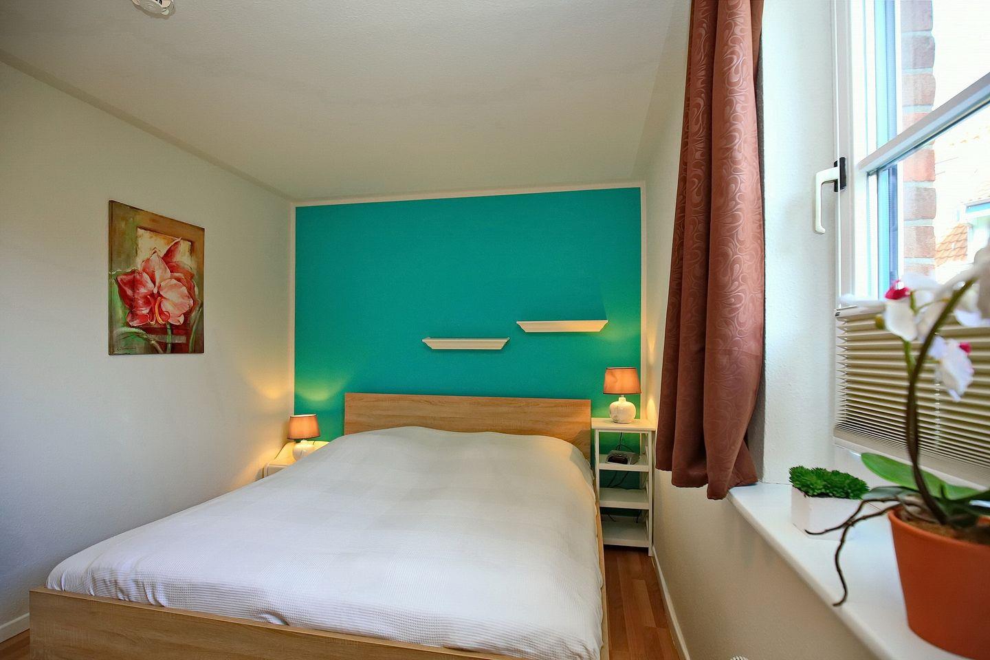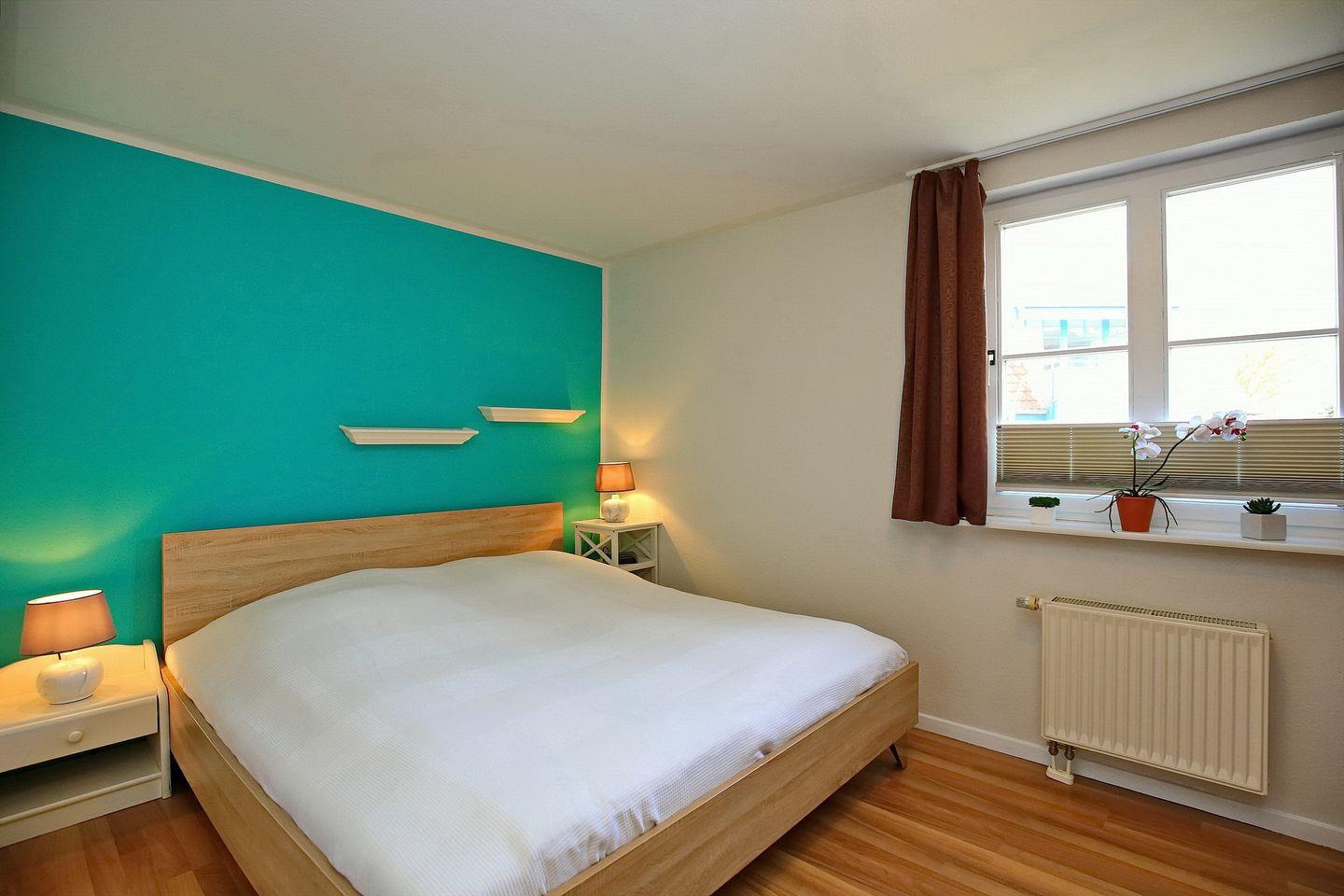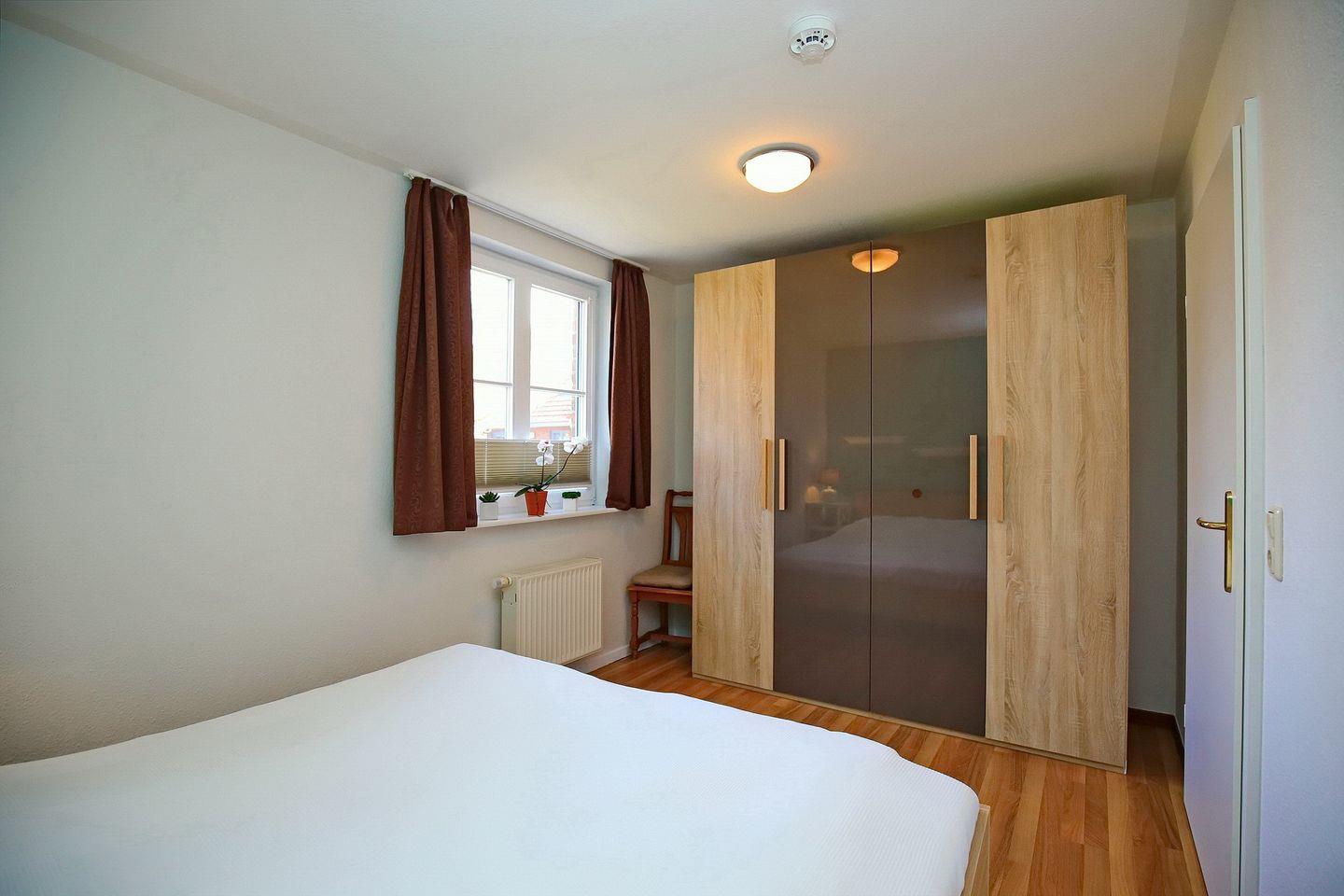 Im modernen Schlafzimmer findest du ein Doppelbett (2 x 90 x 200 cm), einen Radiowecker und einen geräumigen Kleiderschrank vor. An den Fenstern wurden zur Verdunklung Rollos und ein Insektenschutz angebracht.