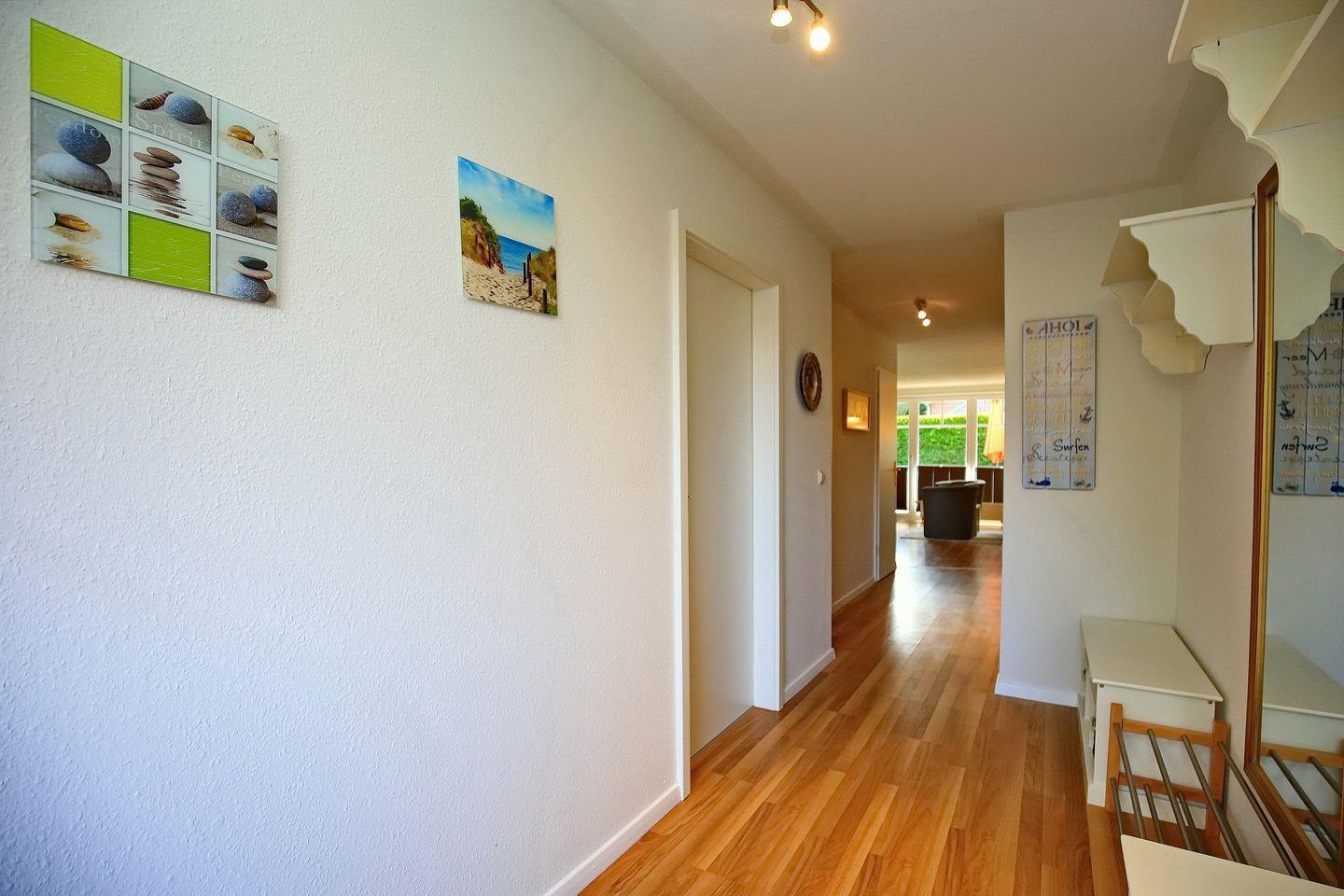 Die integrierte Küchenzeile ist mit einem Backofen mit Cerankochfeld, einem Geschirrspüler, einem Kühlschrank mit Gefrierfach und einer Mikrowelle ausgestattet. In der gesamten Ferienwohnung wurde Laminat verlegt.