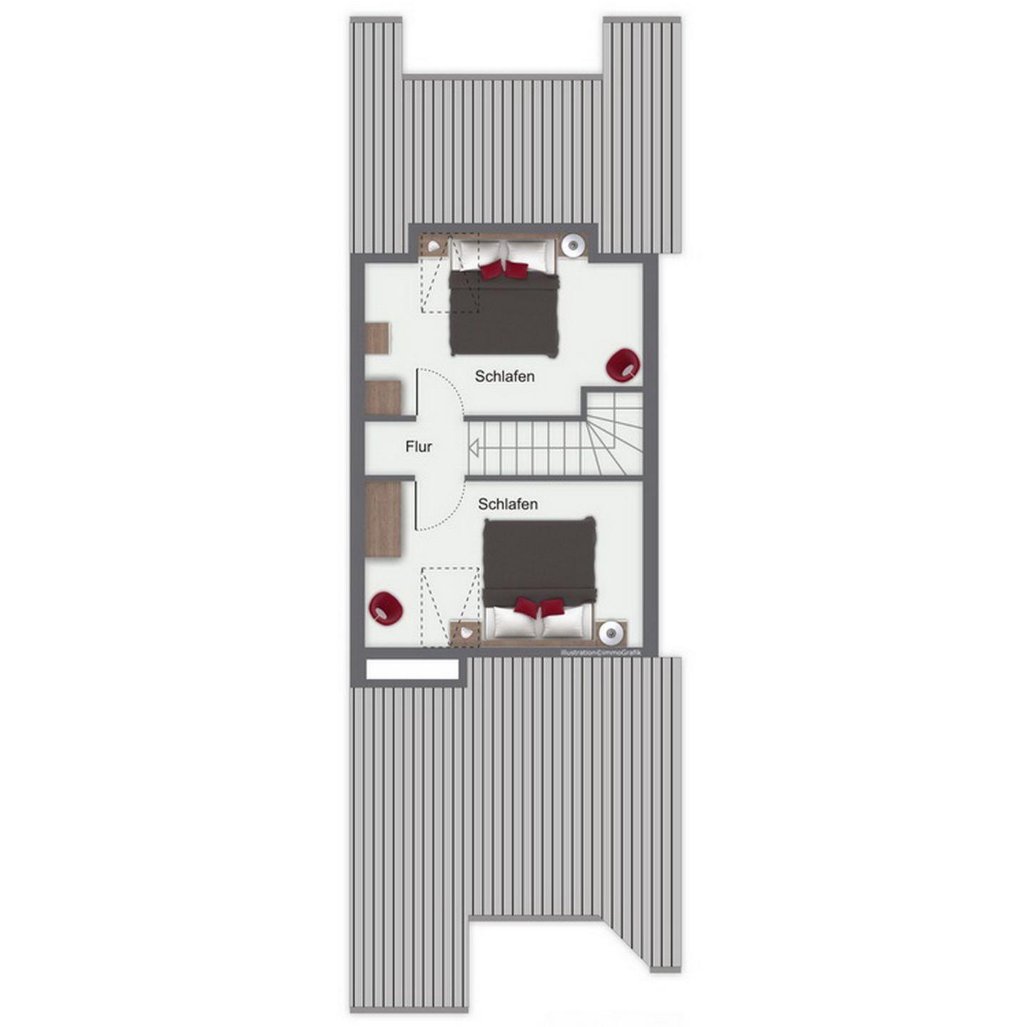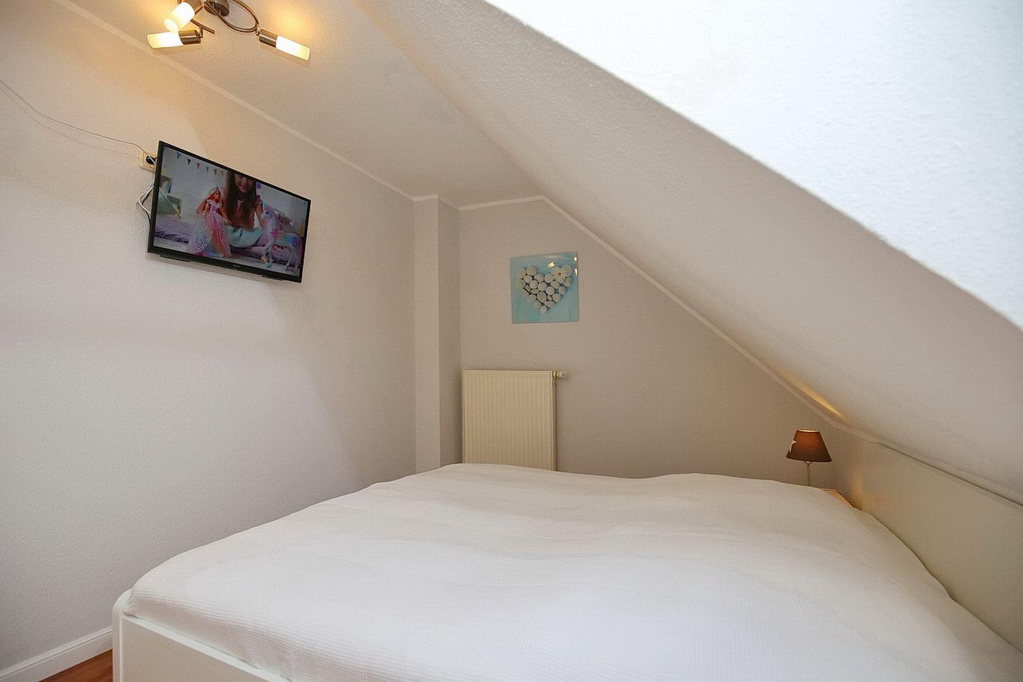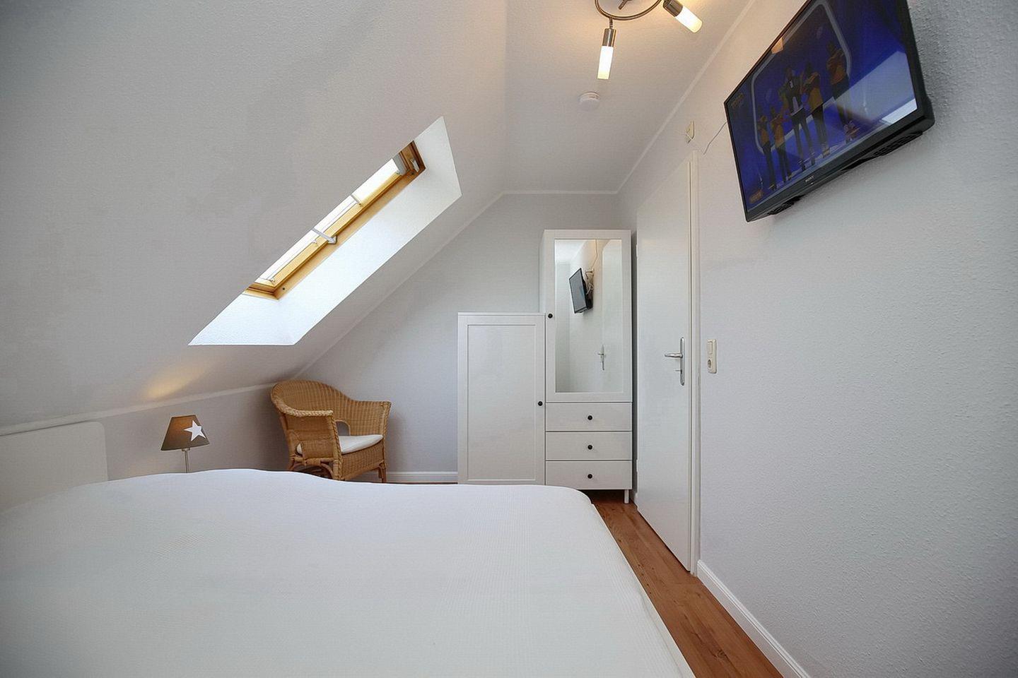 Über die innenliegende Treppe erreichst du das Dachgeschoss mit zwei Schlafräumen. Dort findest du jeweils ein Doppelbett (2 x 90 x 200 cm) und ein Kleiderschrank vor. An den Fenstern sind in allen Schlafbereichen Rollos angebracht.