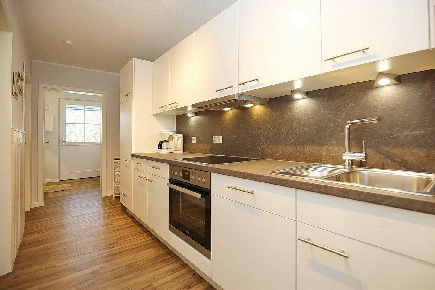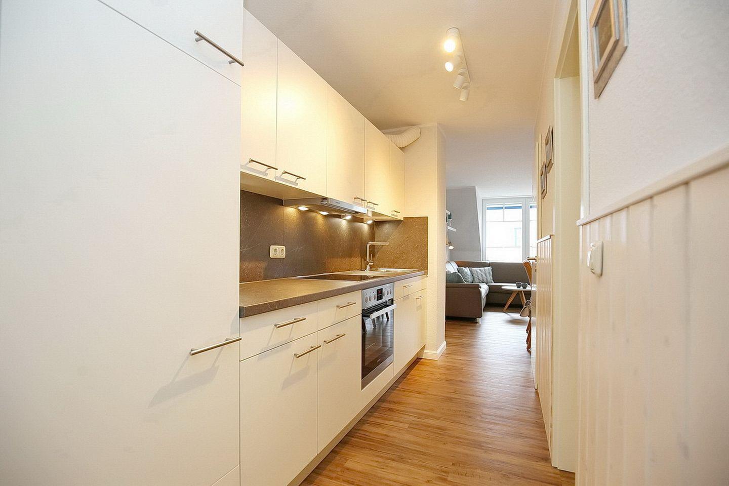Die praktische Küchenzeile ist neben einem Backofen mit 4- Plattenkochfeld, einem Geschirrspüler, einer Mikrowelle und einem Kühlschrank mit Gefrierfach mit allem ausgestattet, was für die Zubereitung der Mahlzeiten benötigt wird. Als Bodenbelag wurde in der gesamten Wohnung Laminat gewählt.